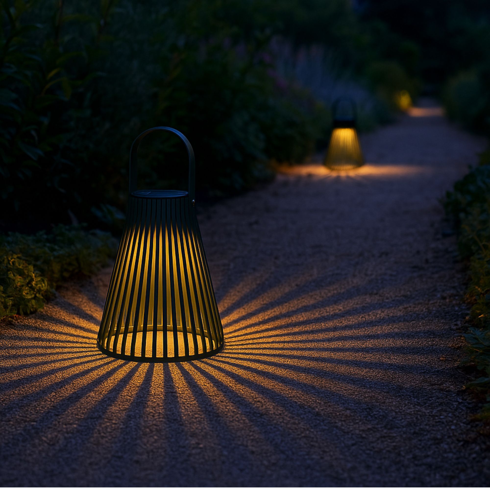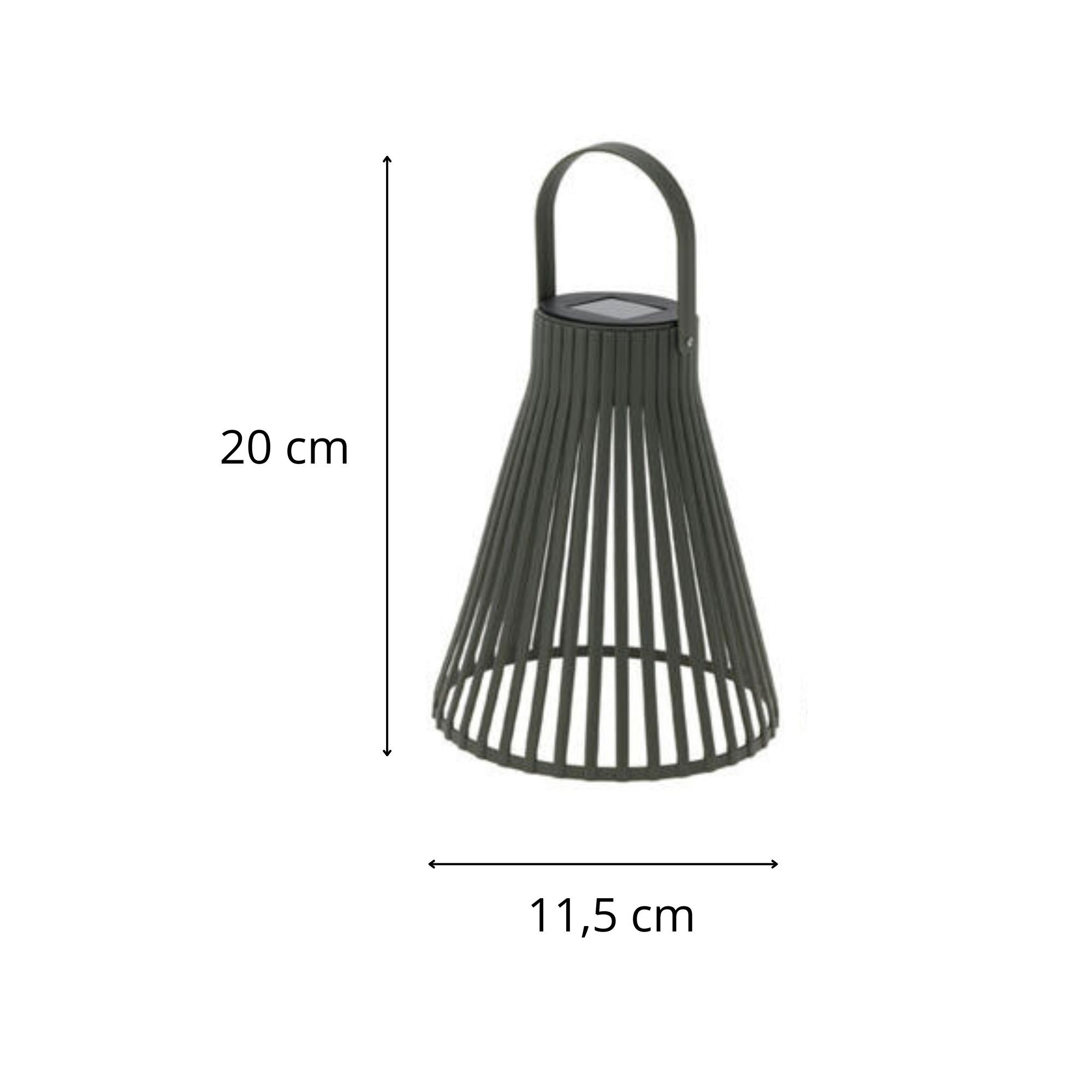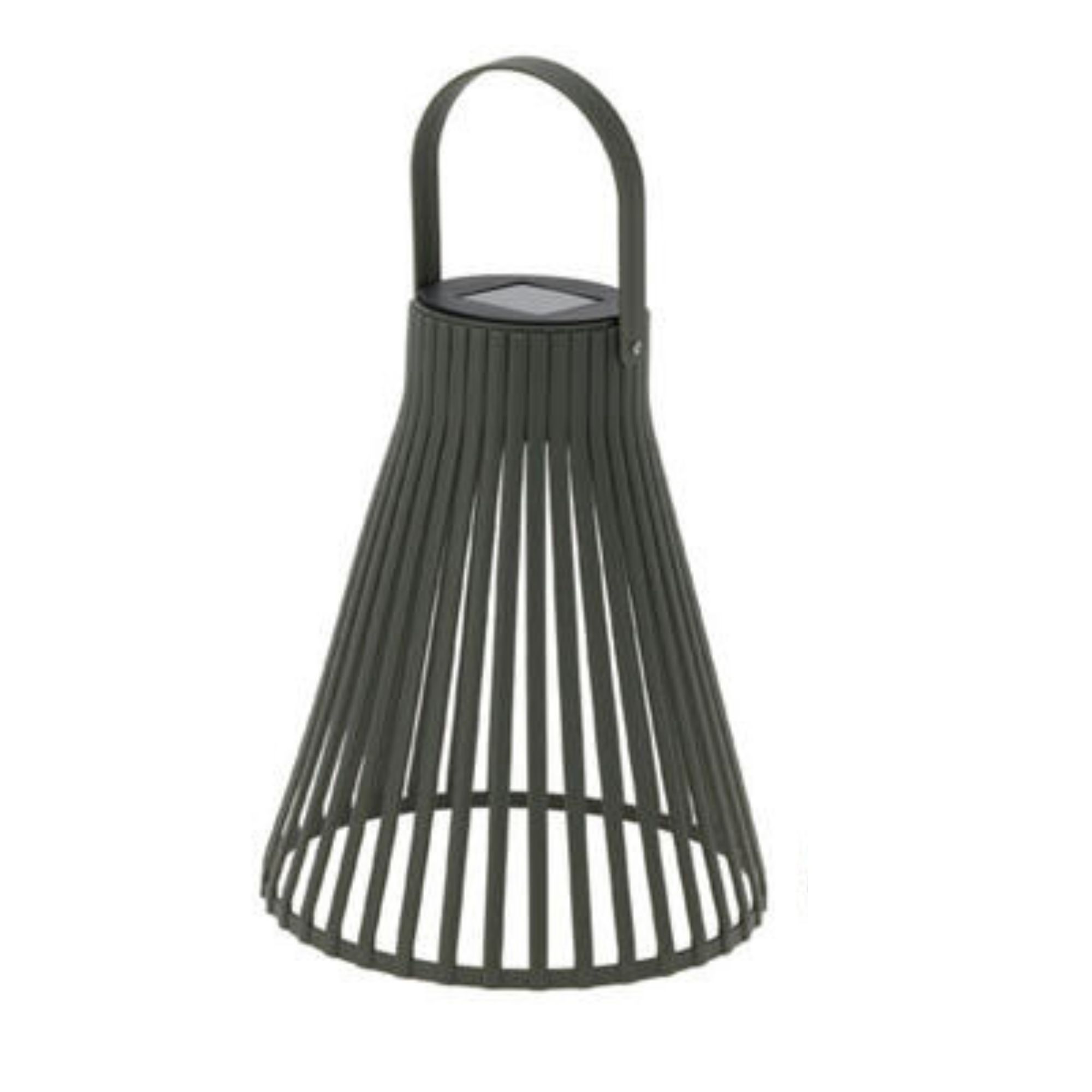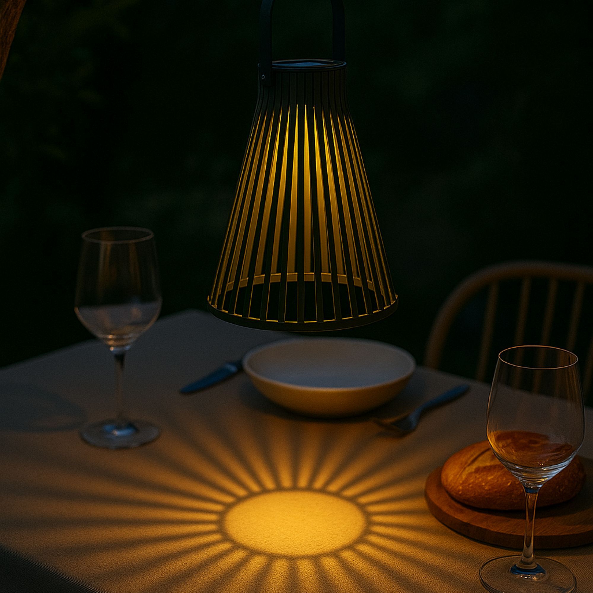 Cette lampe solaire suspendue présente une structure ajourée en forme de cône qui crée des jeux d'ombre et de lumière, tandis que son panneau solaire intégré assure une autonomie complète sans raccordement électrique.