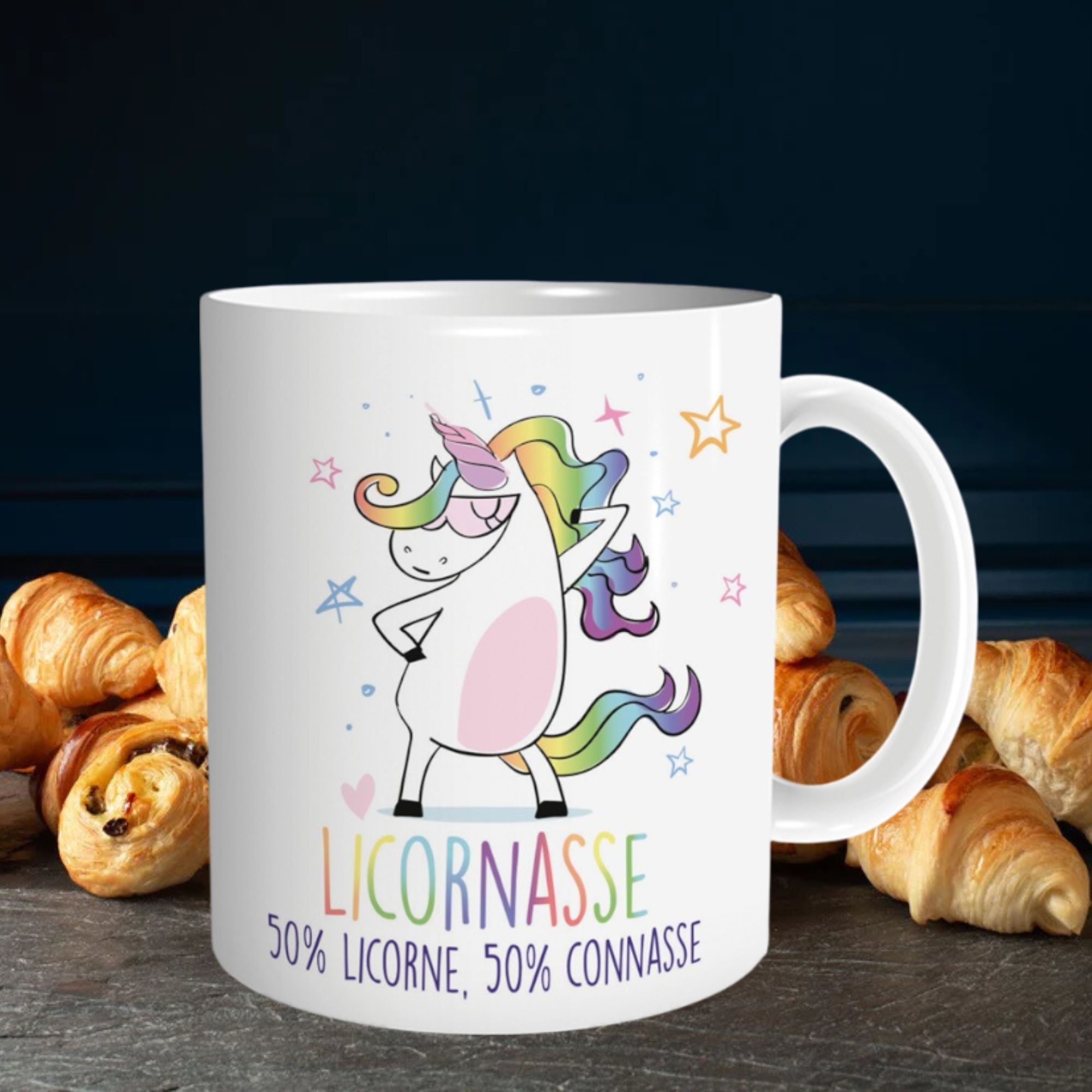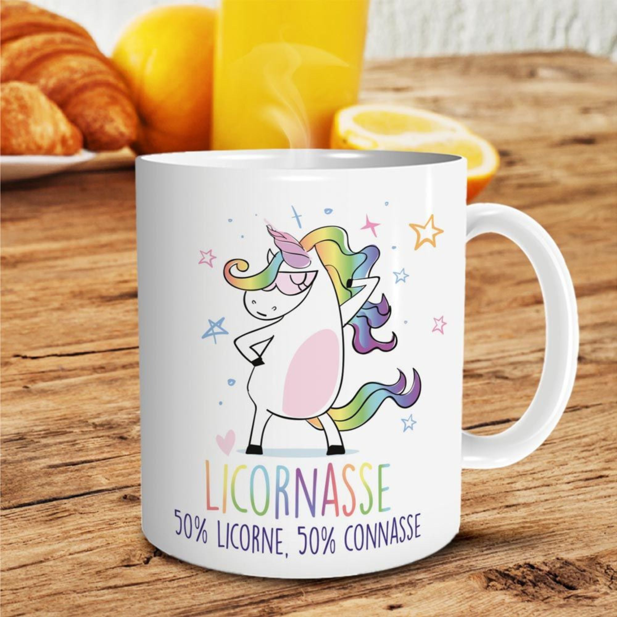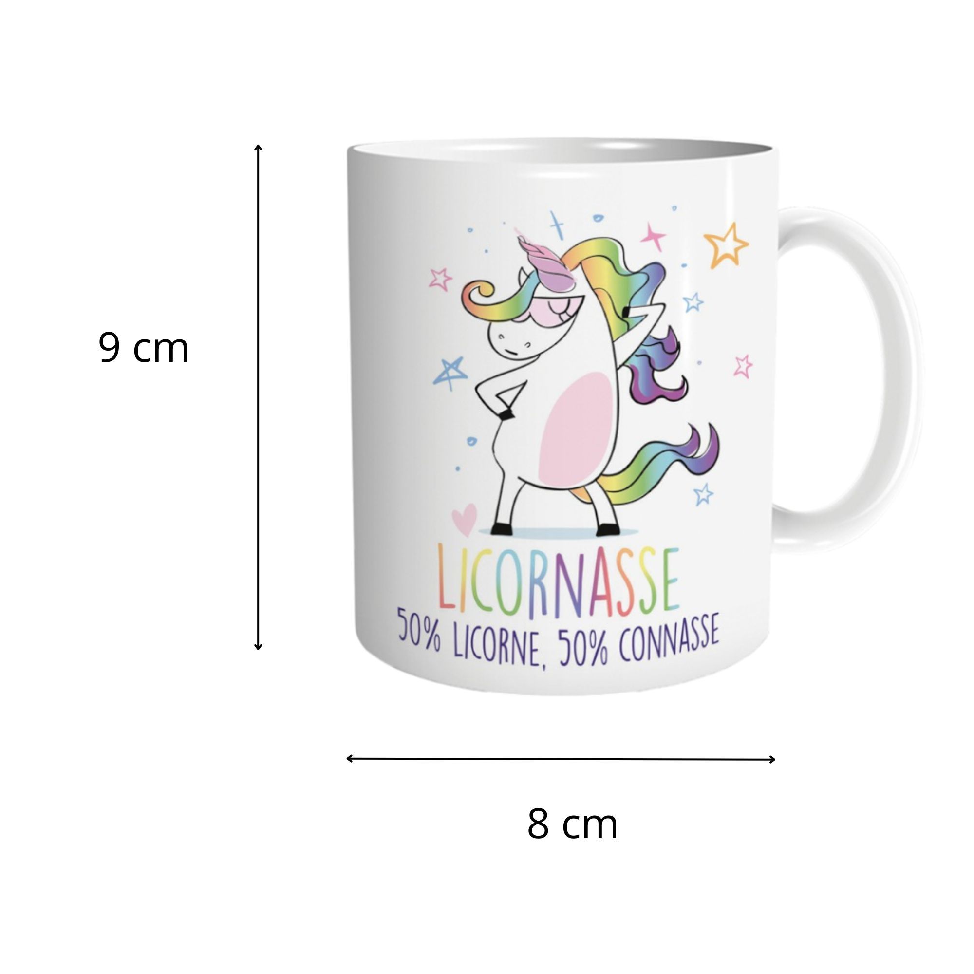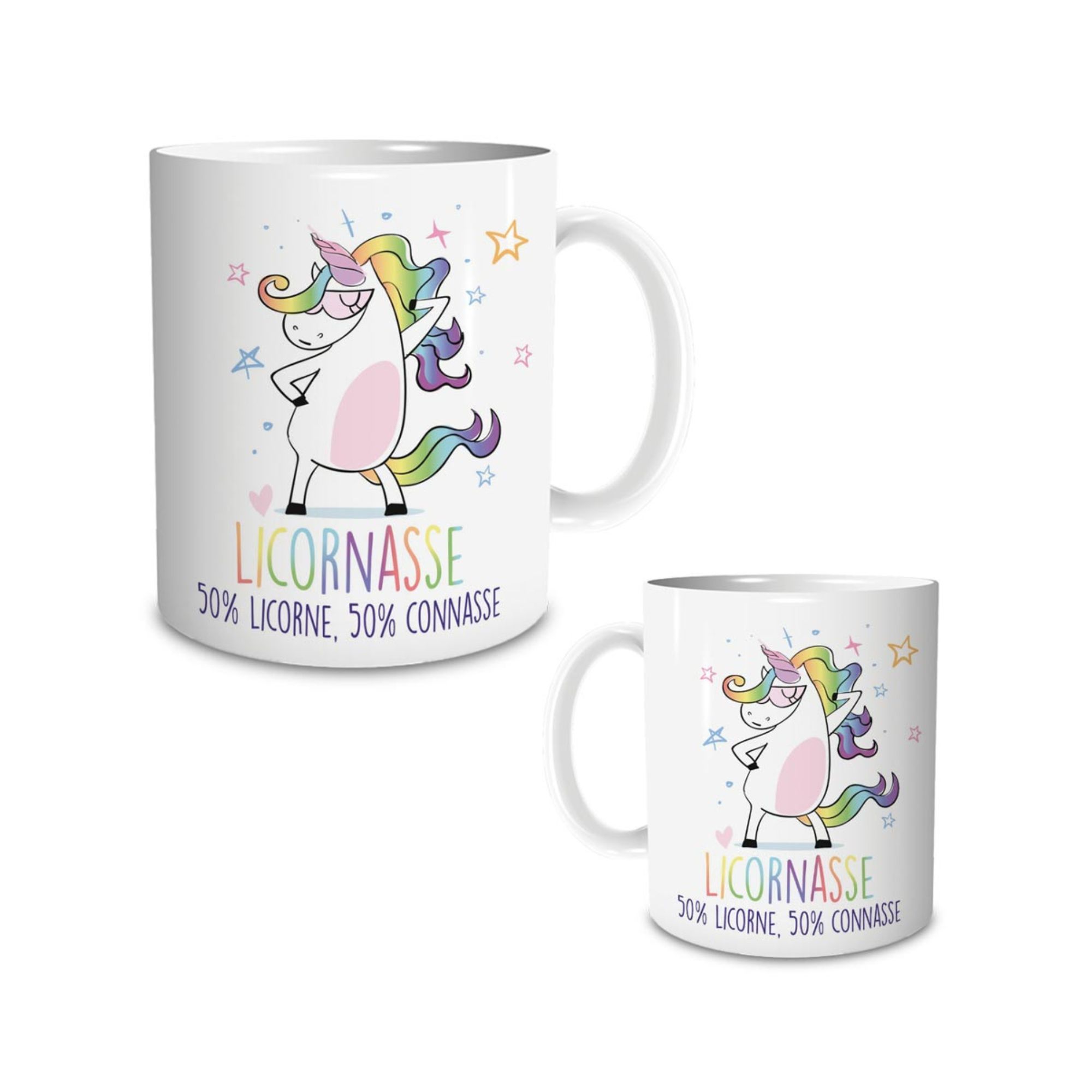Envie d’un mug qui reflète ta personnalité haute en couleur et sans filtre ? Le mug “Licornasse – 50% Licorne, 50% Connasse” est fait pour toi (ou pour offrir à celle qui le mérite). Avec sa licorne badass et son message hilarant, il allie féérie et franchise à la perfection.