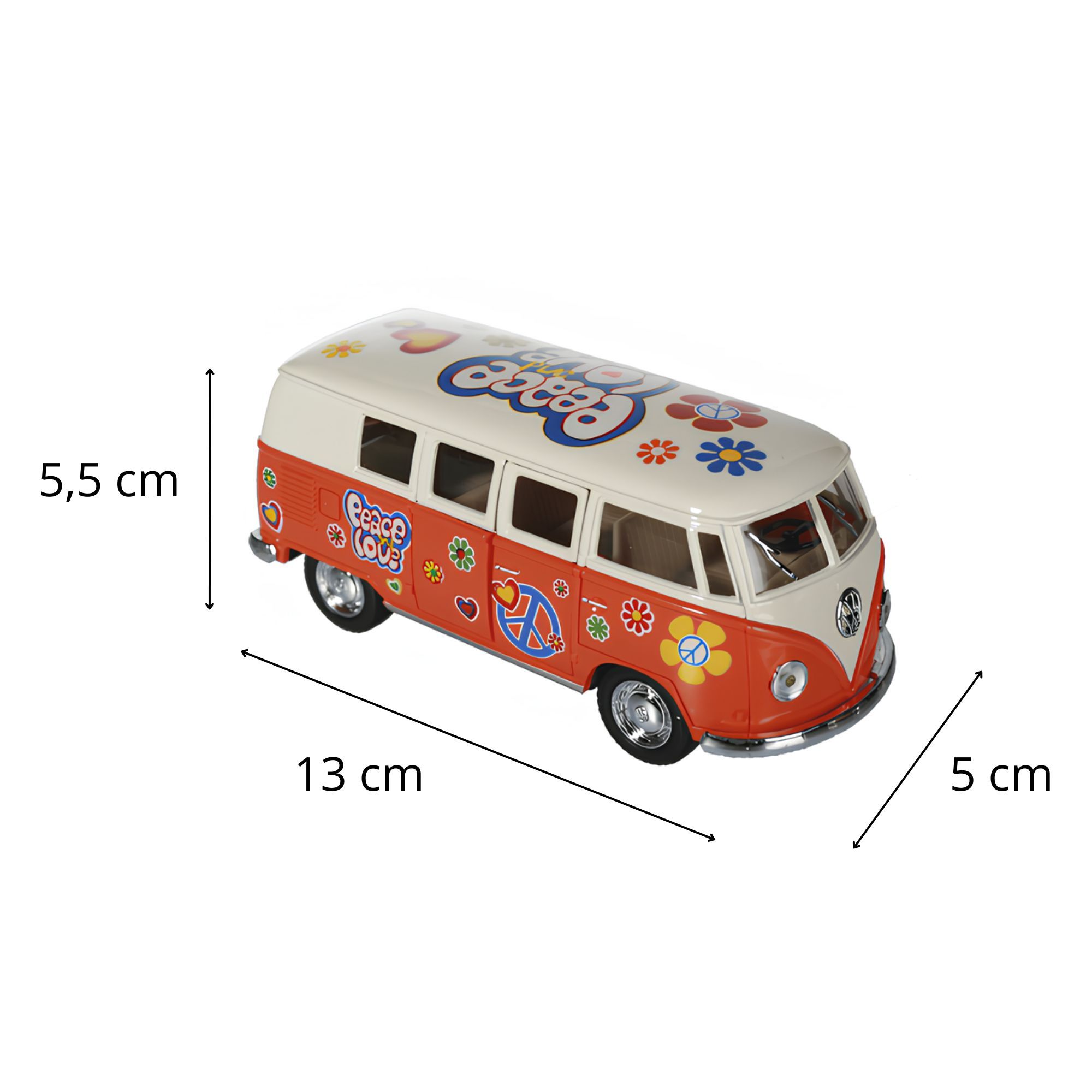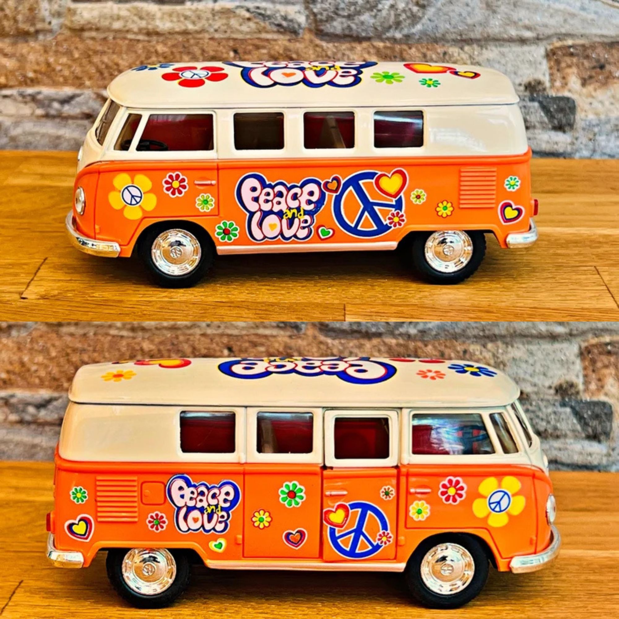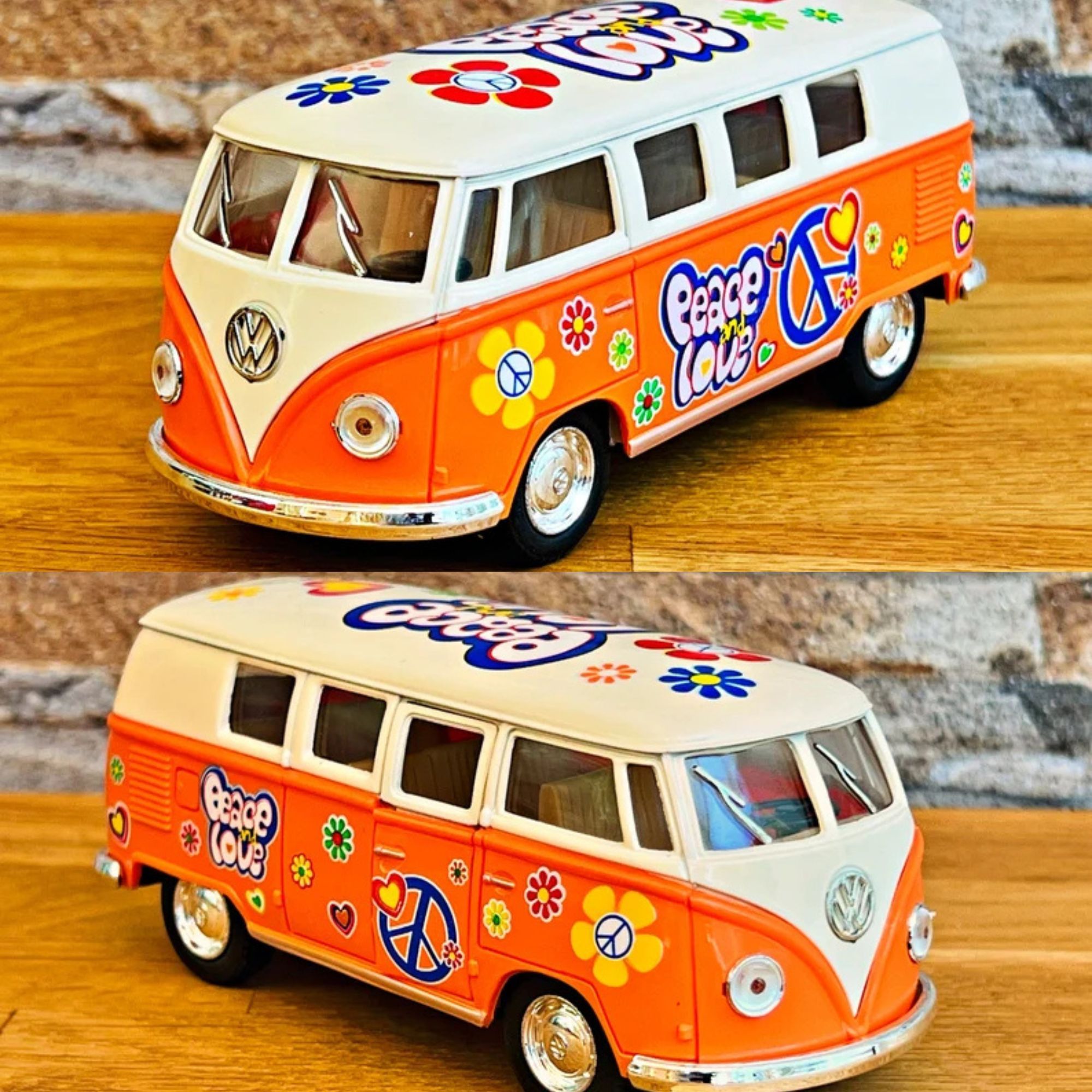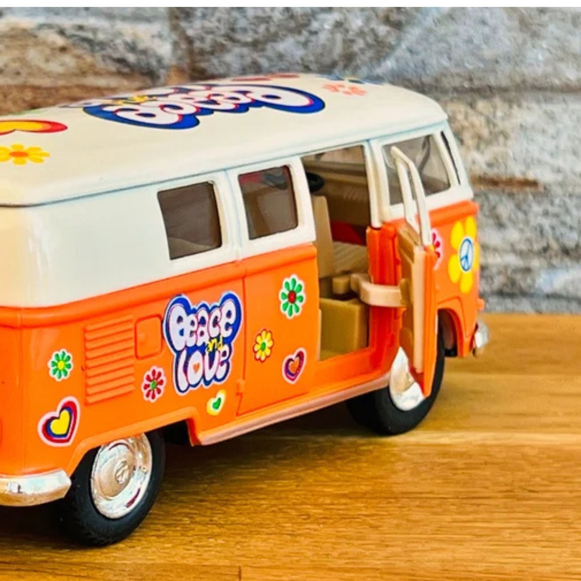 Ce mini bus à friction est disponible en quatre couleurs vives : Orange, Rouge, jaune, Bleu . Chacune de ces teintes capture l'esprit des années 60, permettant à chaque collectionneur de choisir sa couleur préférée.
