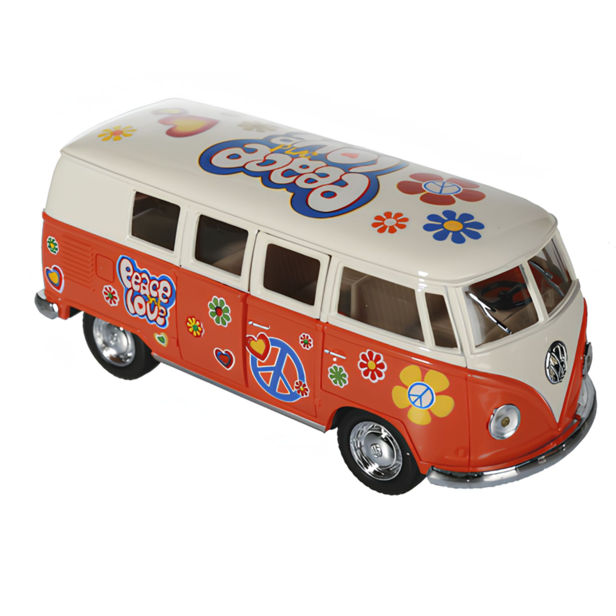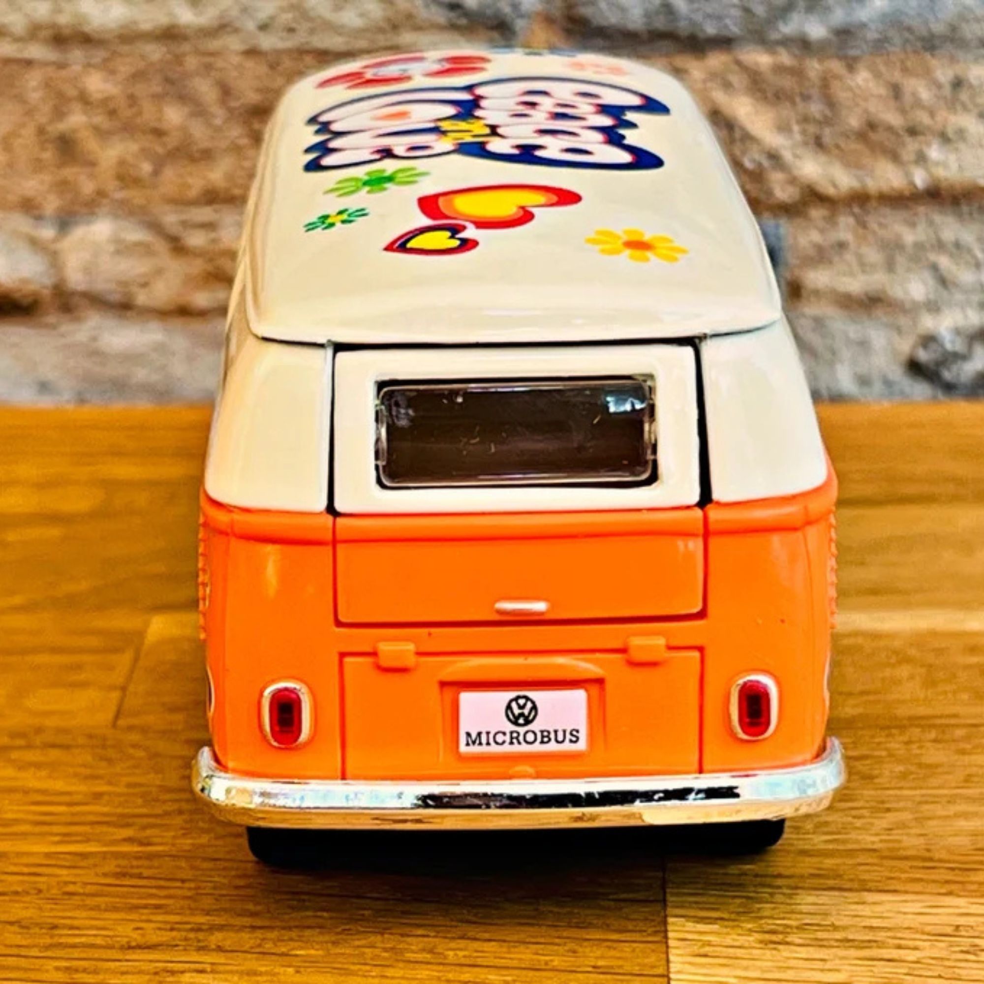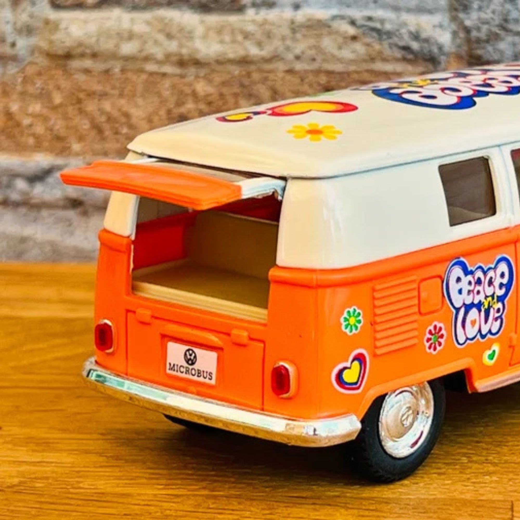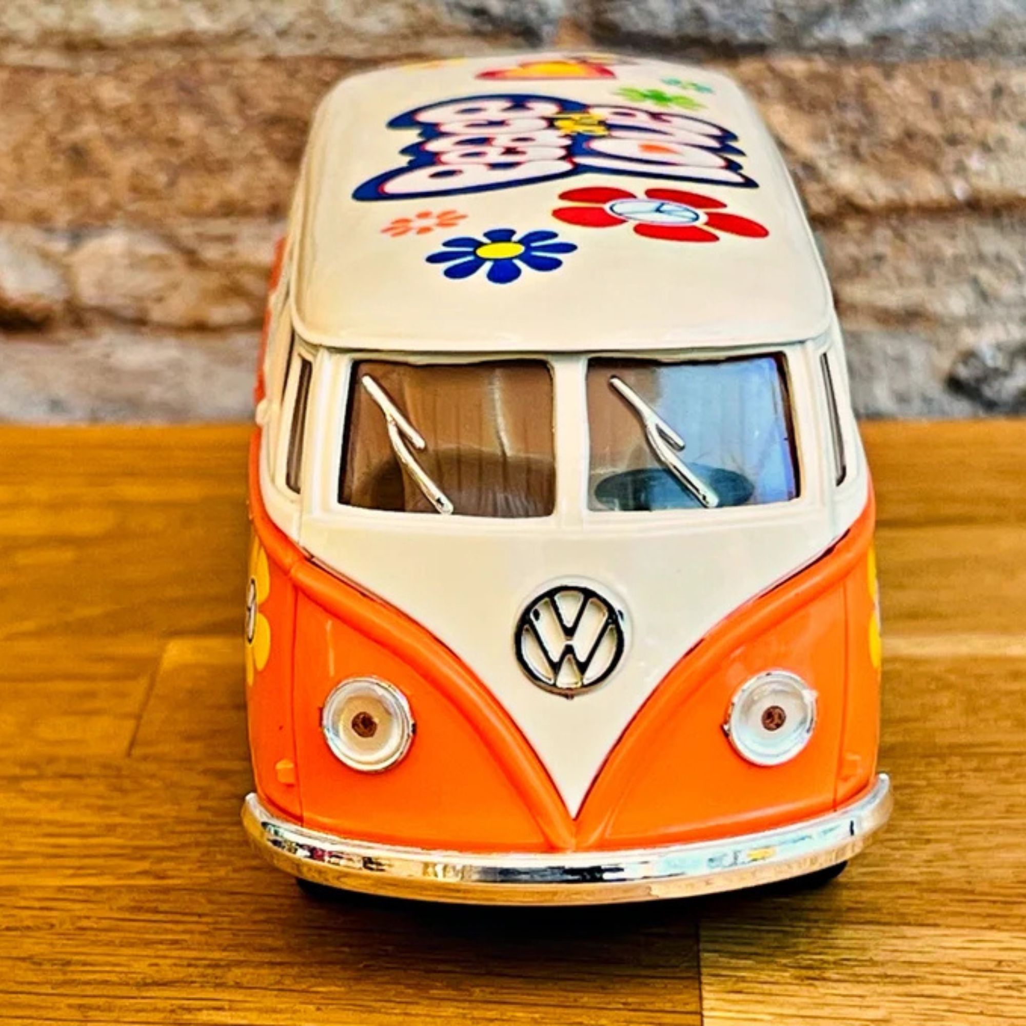 Ce mini bus à friction est disponible en quatre couleurs vives : Orange, Rouge, jaune, Bleu . Chacune de ces teintes capture l'esprit des années 60, permettant à chaque collectionneur de choisir sa couleur préférée.