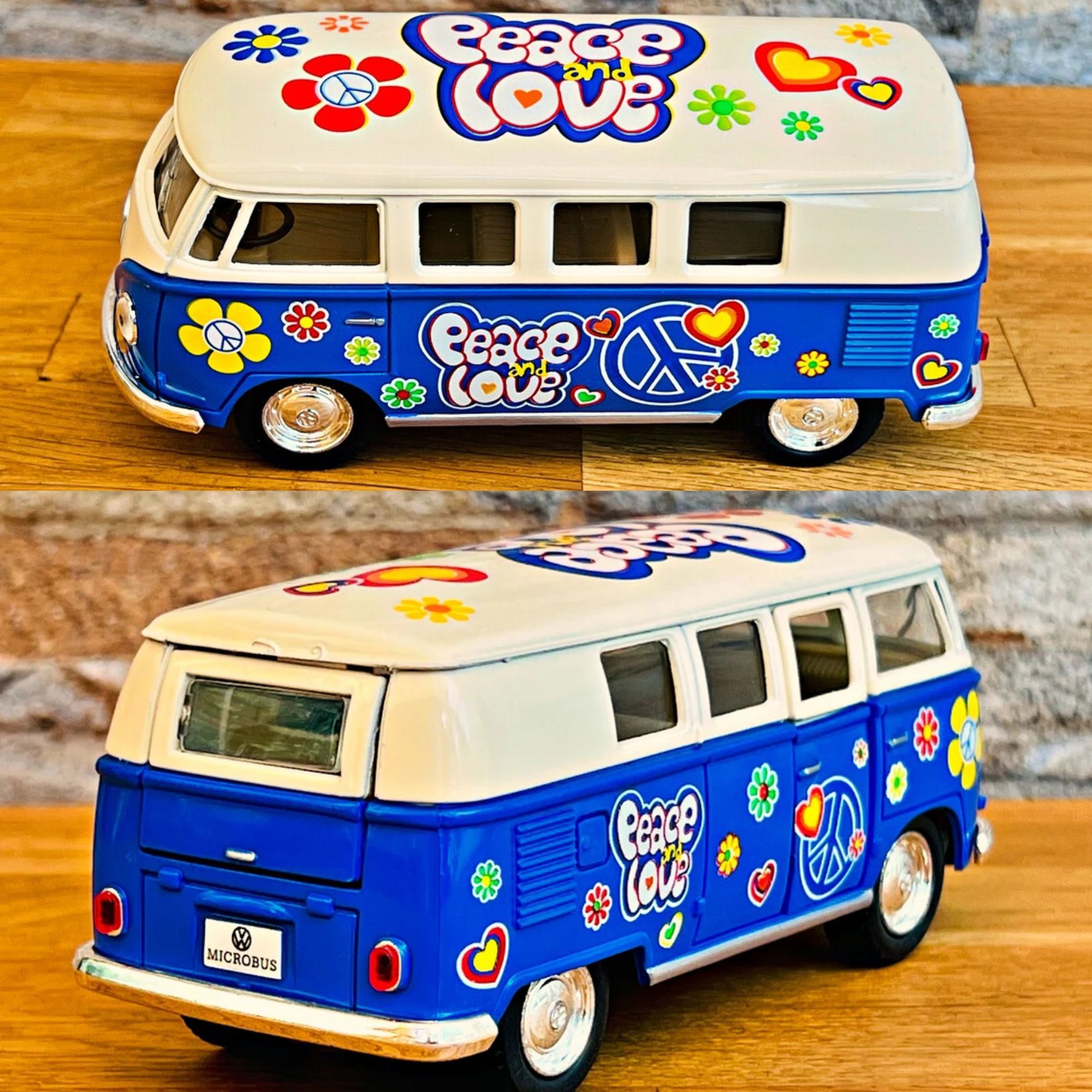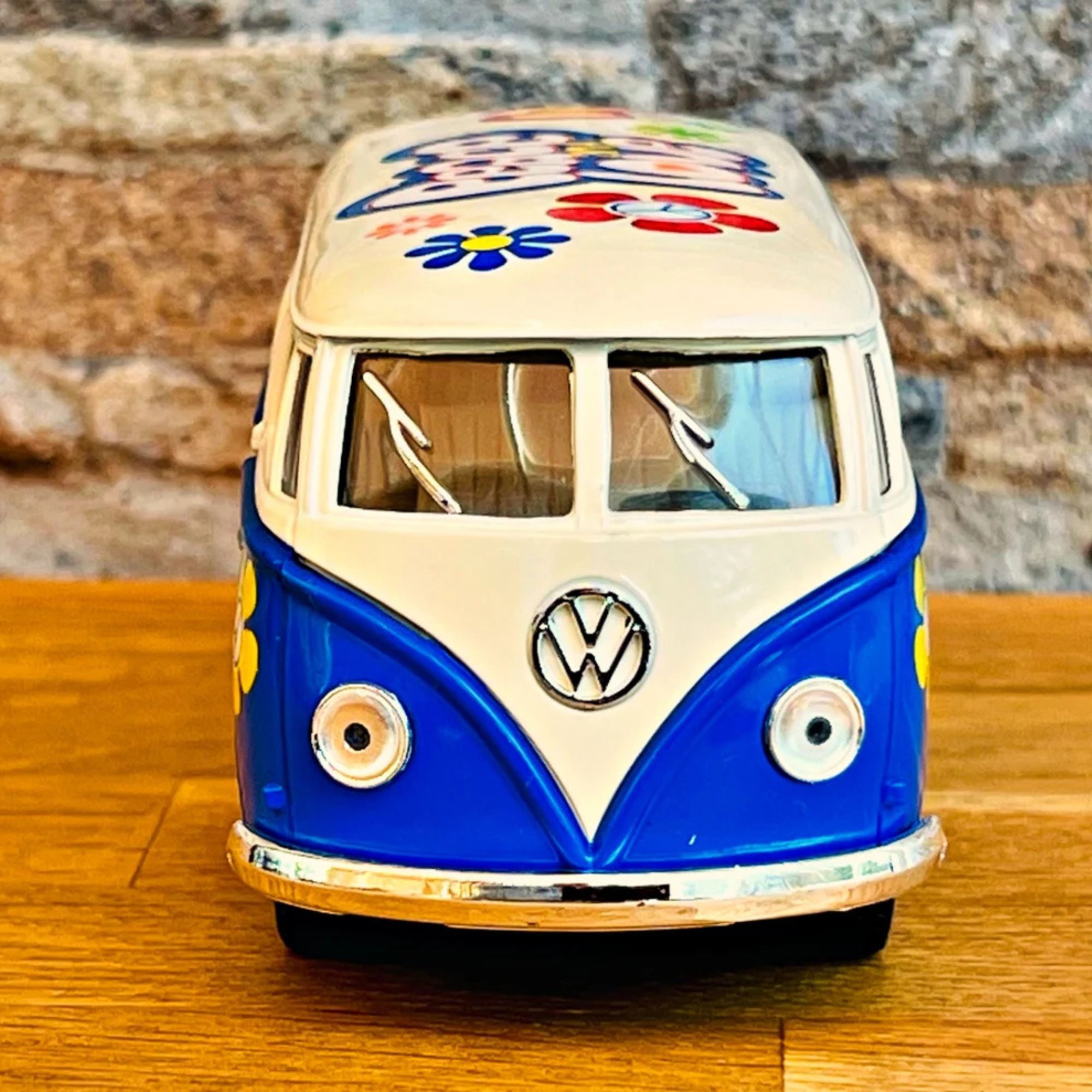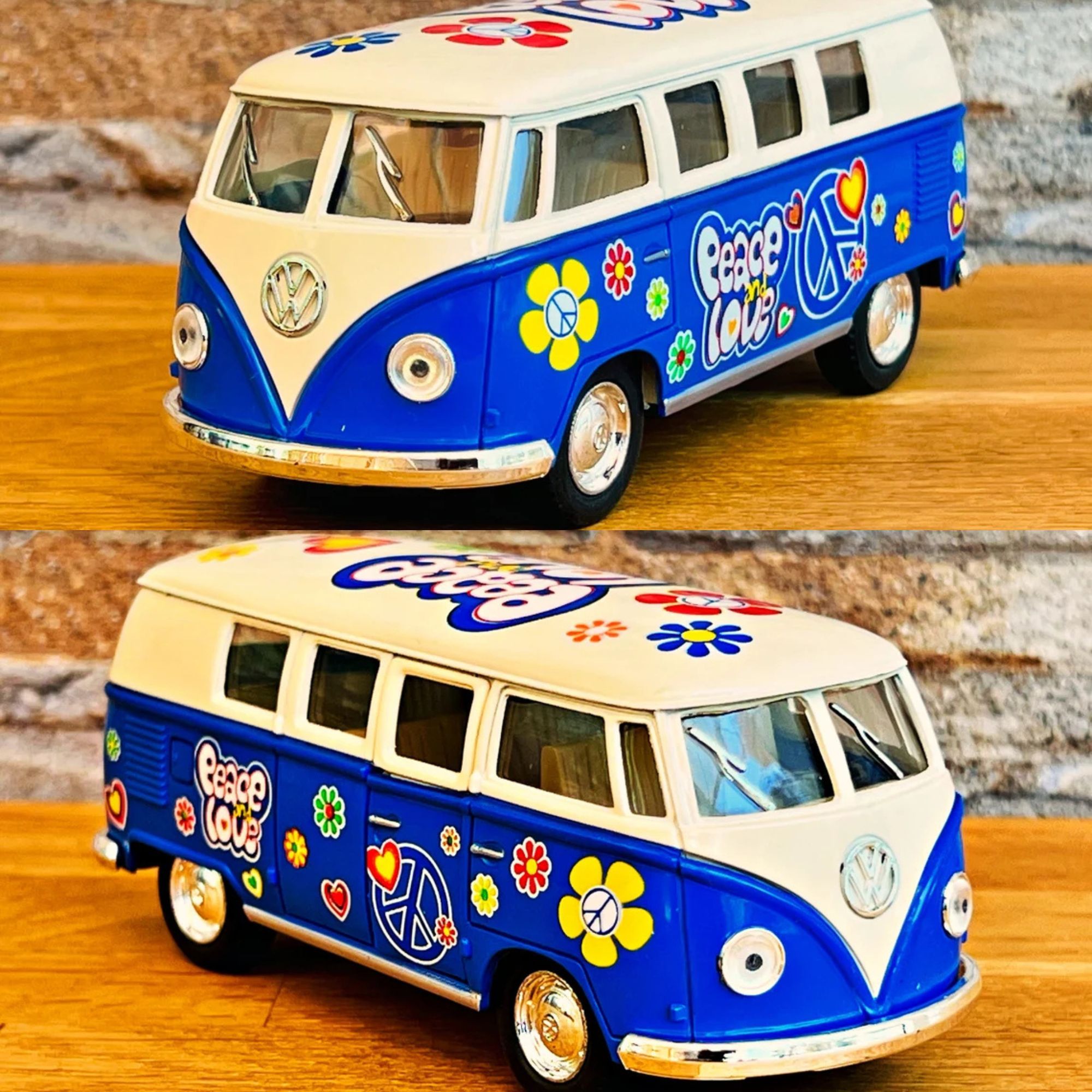 Ce mini bus à friction est disponible en quatre couleurs vives : Orange, Rouge, jaune, Bleu . Chacune de ces teintes capture l'esprit des années 60, permettant à chaque collectionneur de choisir sa couleur préférée.