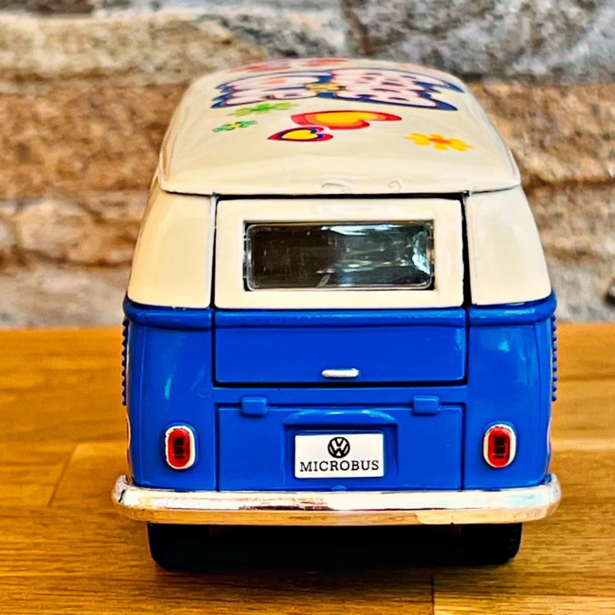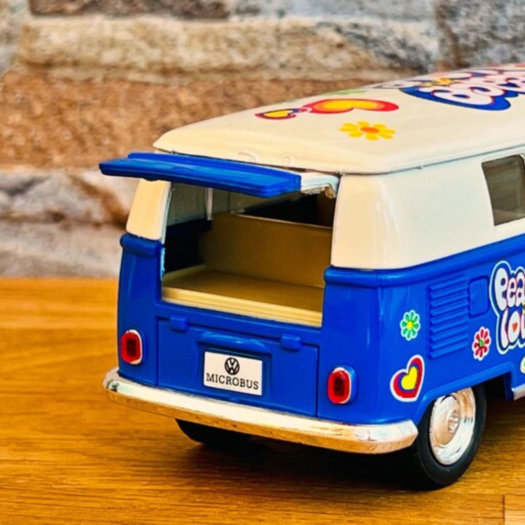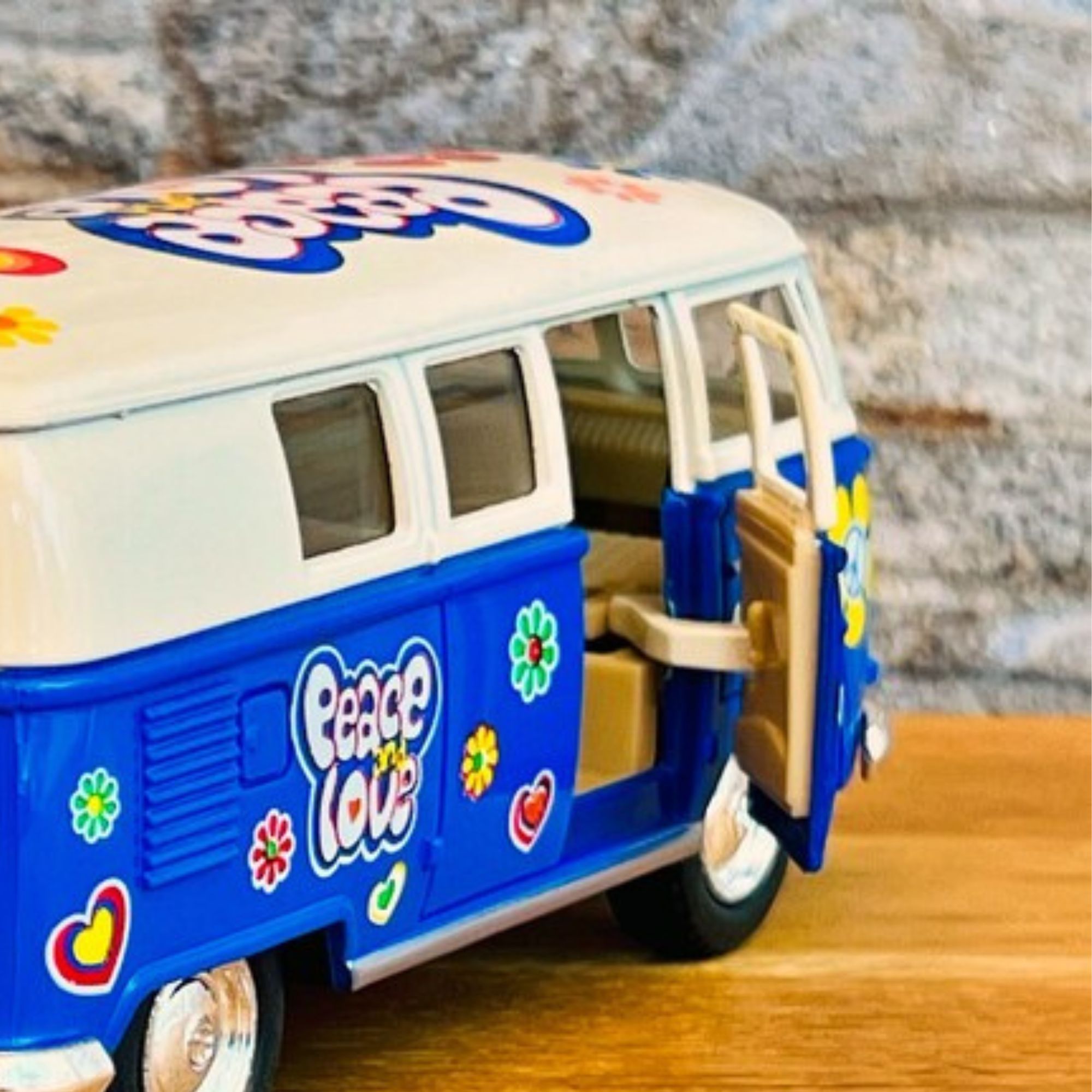 Ce mini bus à friction est disponible en quatre couleurs vives : Orange, Rouge, jaune, Bleu . Chacune de ces teintes capture l'esprit des années 60, permettant à chaque collectionneur de choisir sa couleur préférée.