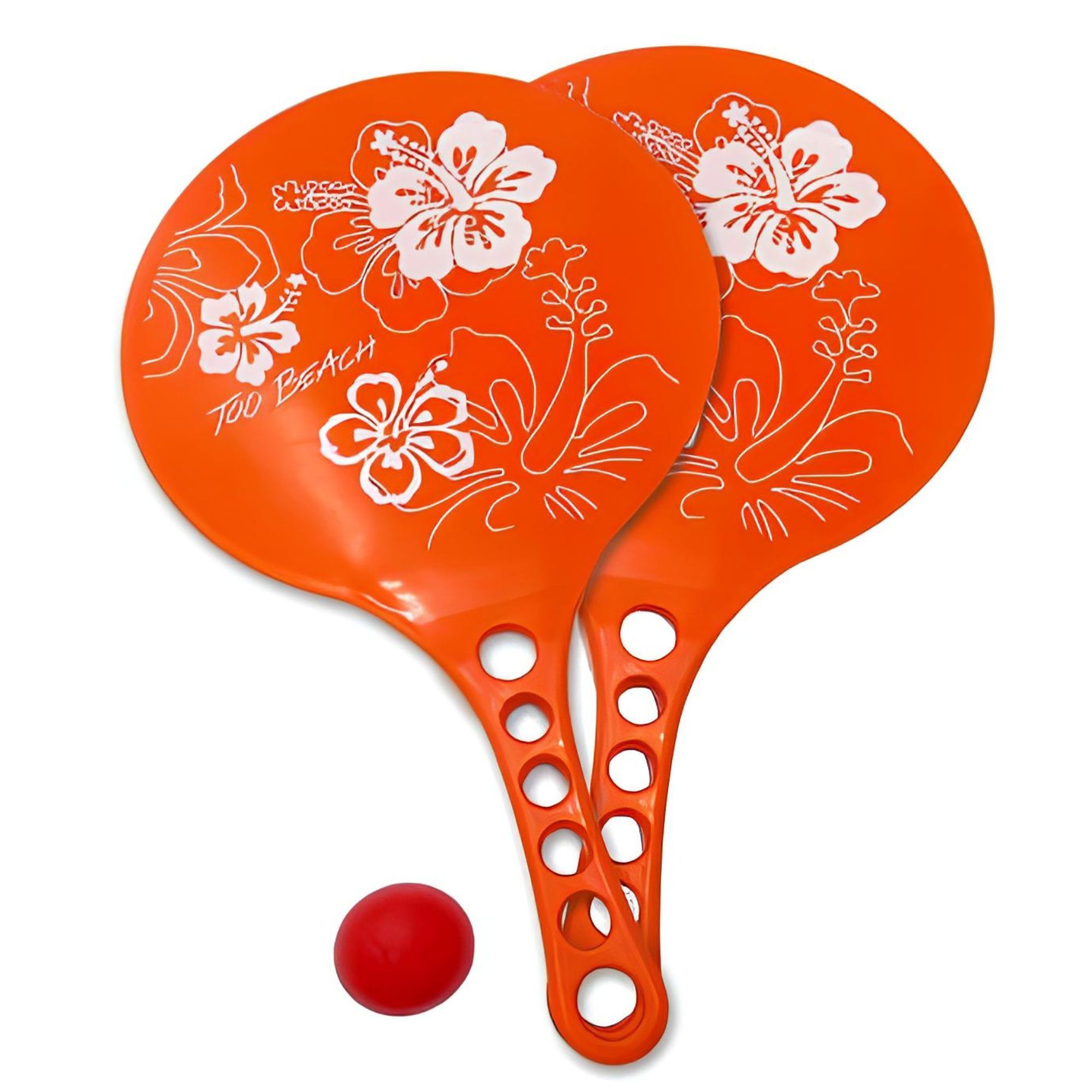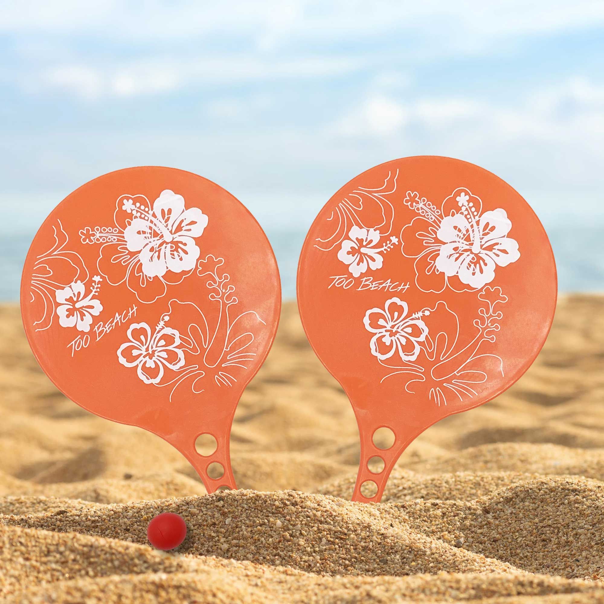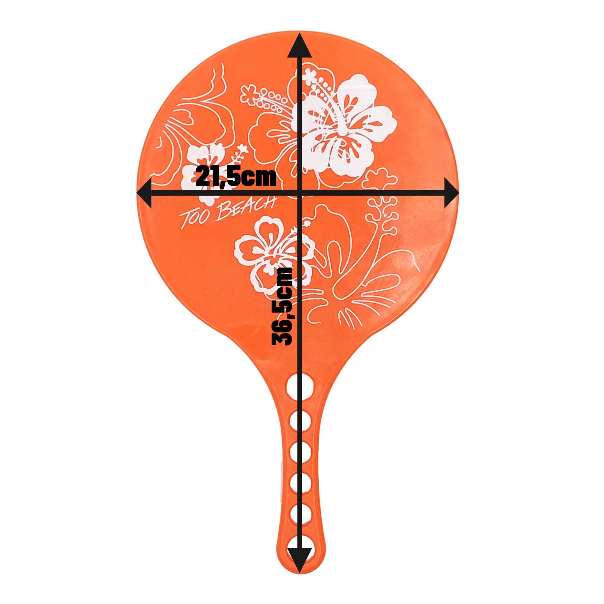 Découvrez nos raquettes de plage en plastique ornée d'un motif hibiscus blanc. Disponible en trois couleurs vives - orange, bleu clair et bleu foncé. Dimensions de 36,5 x 21,5 cm. Parfaites pour des heures de divertissement estival sous le soleil. Commandez maintenant et profitez de l'été en toute décontraction !