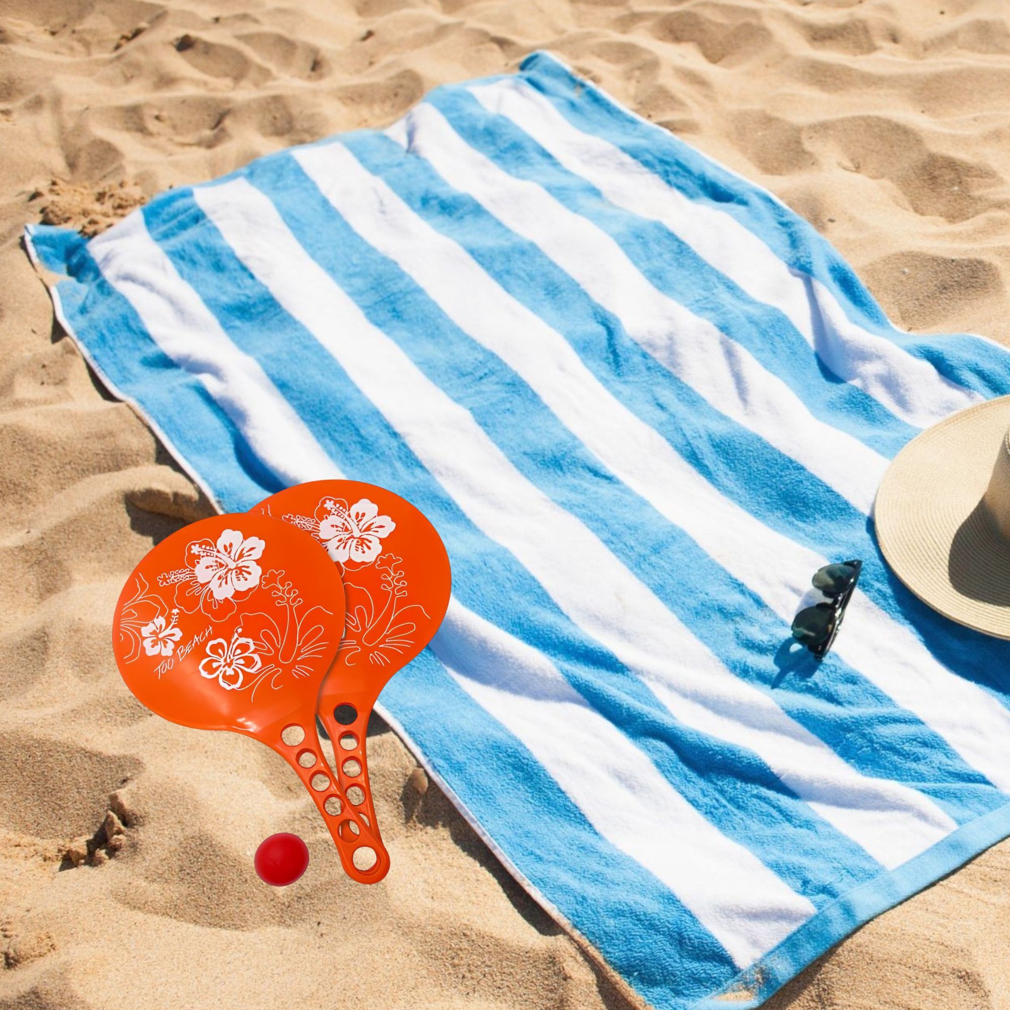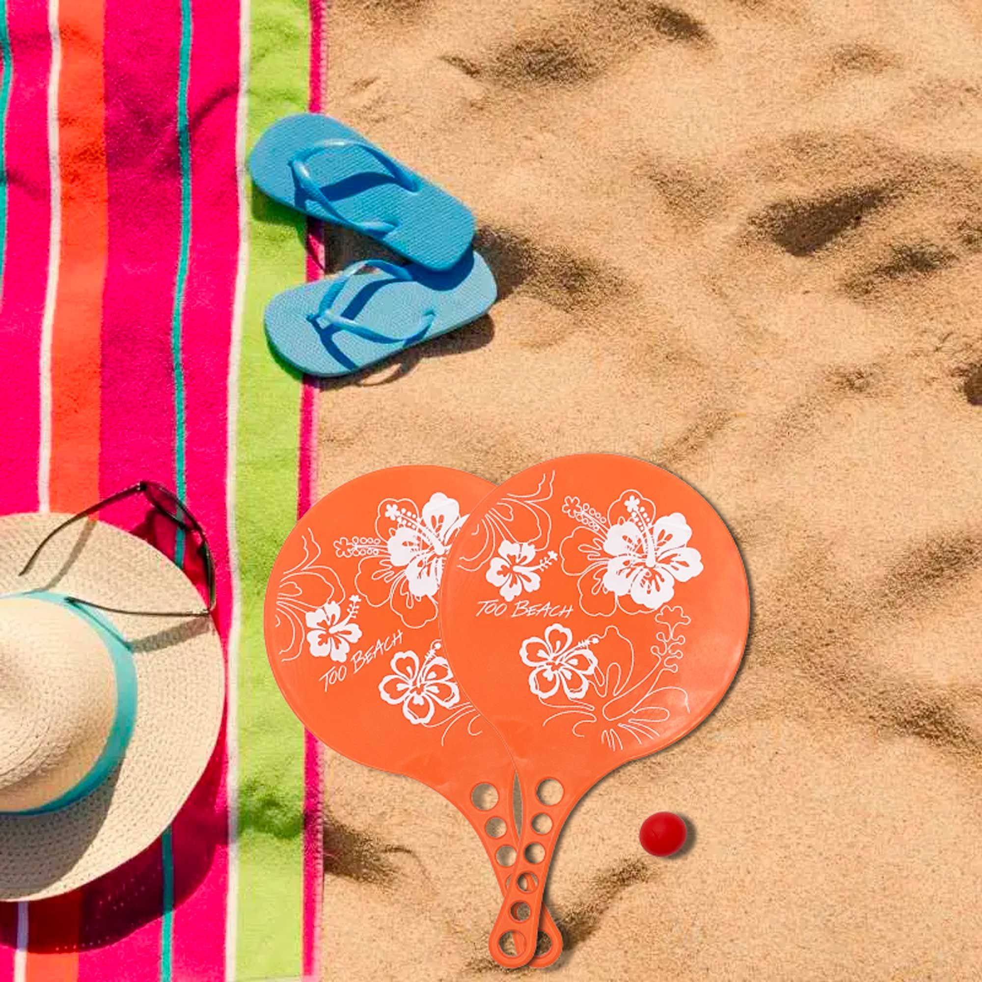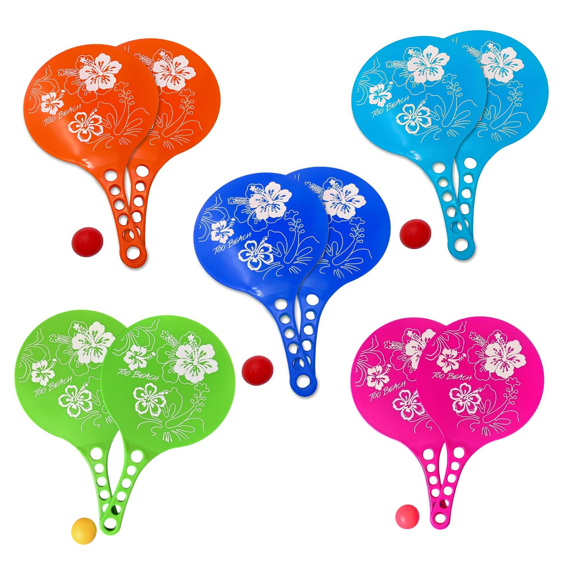 Découvrez nos raquettes de plage en plastique ornée d'un motif hibiscus blanc. Disponible en trois couleurs vives - orange, bleu clair et bleu foncé. Dimensions de 36,5 x 21,5 cm. Parfaites pour des heures de divertissement estival sous le soleil. Commandez maintenant et profitez de l'été en toute décontraction !