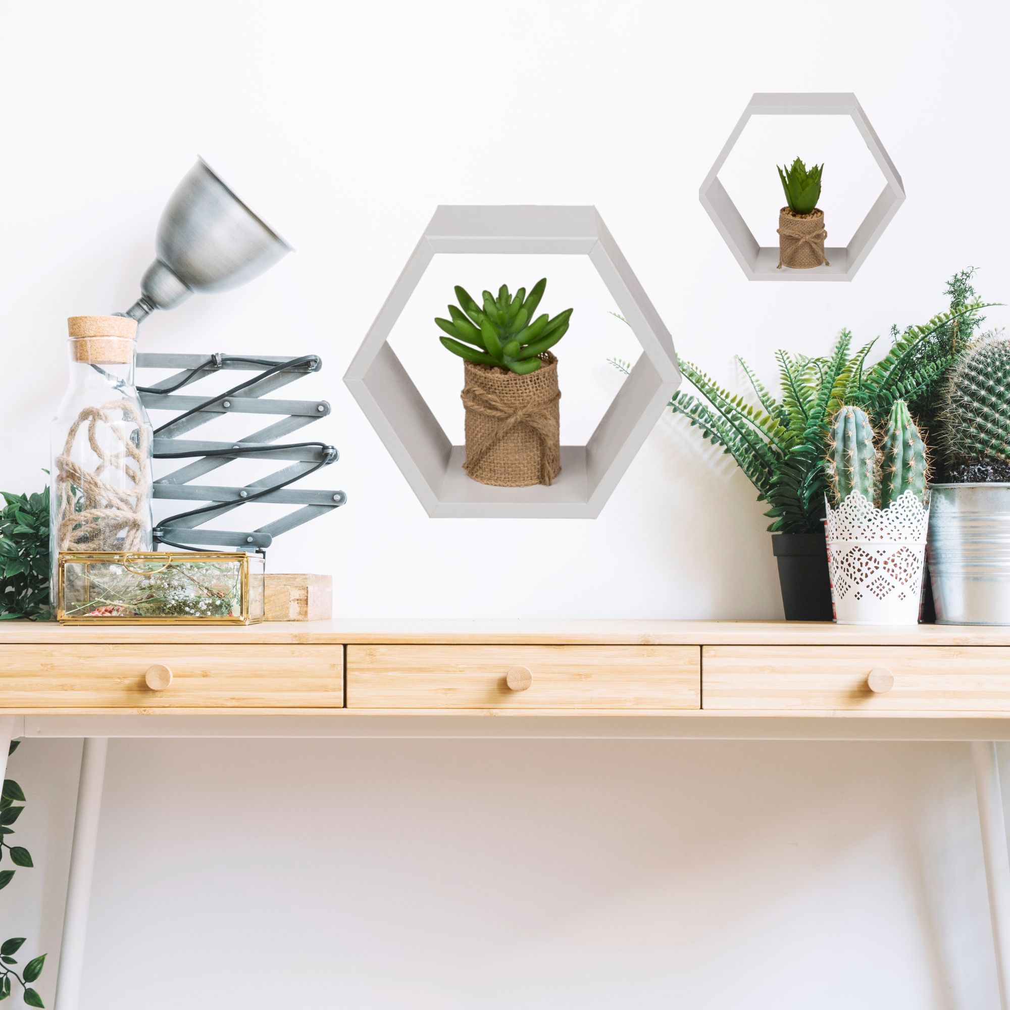Idéales pour mettre en valeur des objets décoratifs, ces étagères géométriques peuvent accueillir livres, bougies, cadres photo et plus encore.