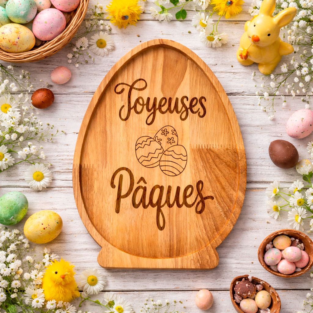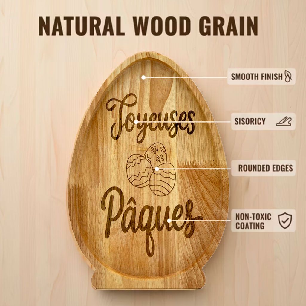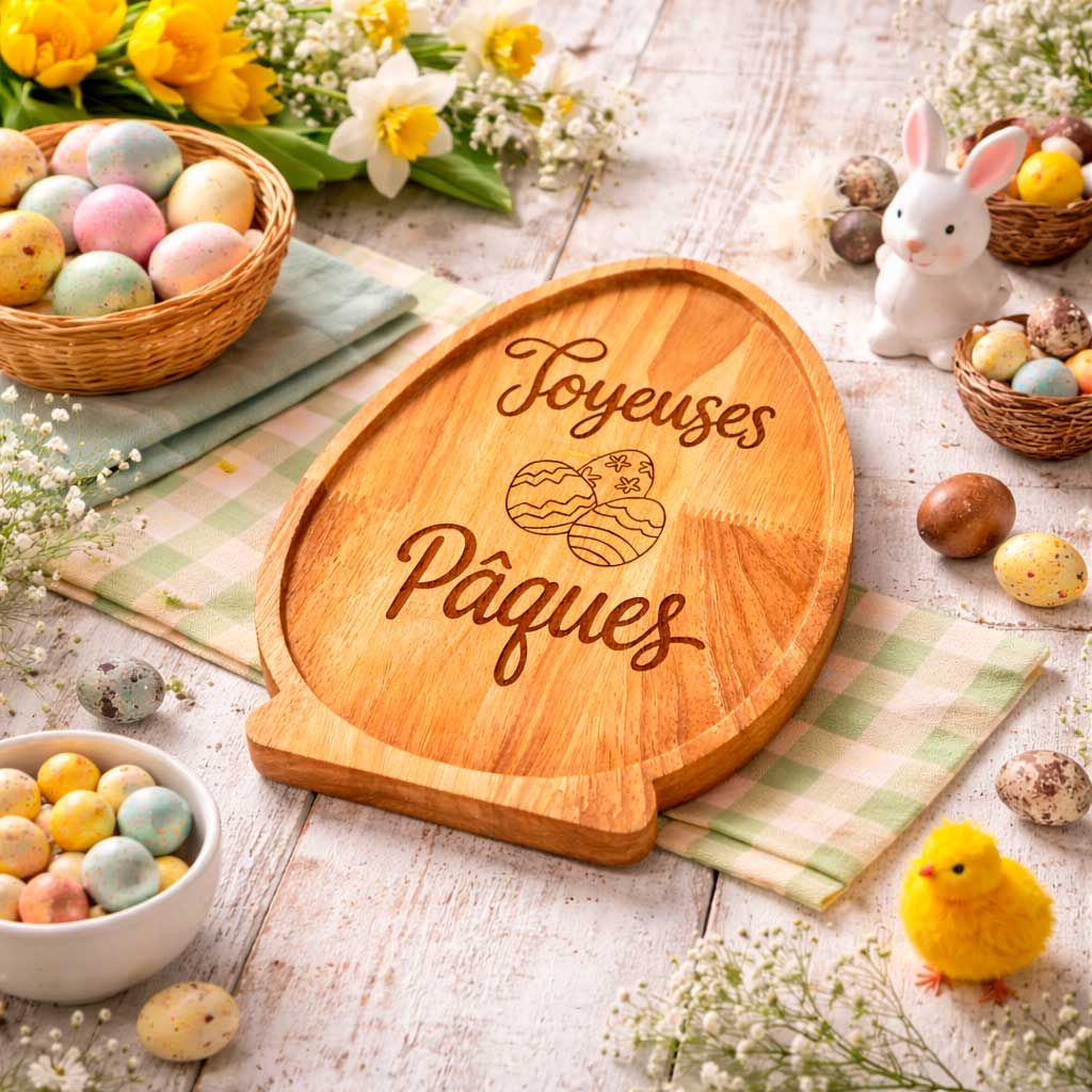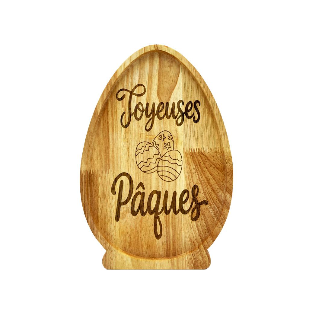 Sublimez vos moments de partage avec ce plateau en bois naturel spécialement dessiné pour les fêtes pascales. Sa forme d'œuf iconique, sa base stable et sa gravure soignée "Joyeuses Pâques" en font bien plus qu'un simple ustensile : c'est une véritable pièce de décoration qui invite à la gourmandise et à la célébration.