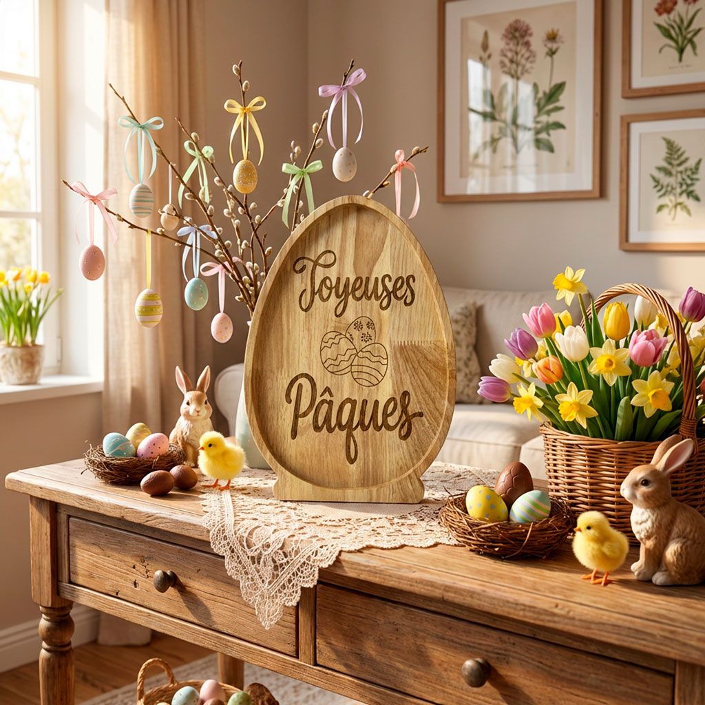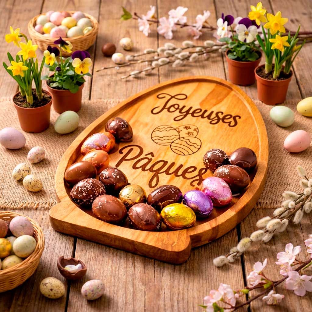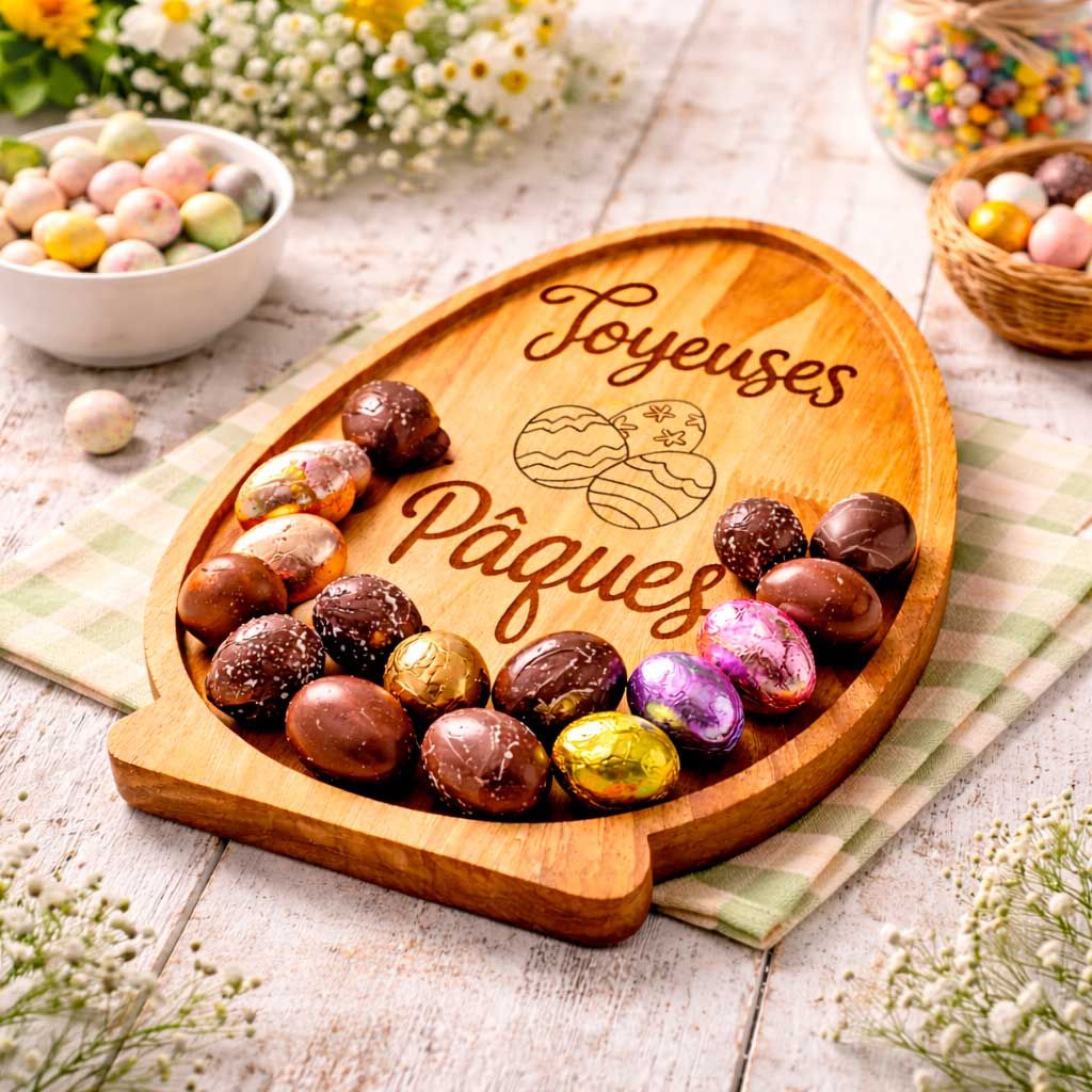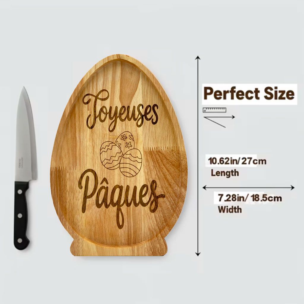 Sublimez vos moments de partage avec ce plateau en bois naturel spécialement dessiné pour les fêtes pascales. Sa forme d'œuf iconique, sa base stable et sa gravure soignée "Joyeuses Pâques" en font bien plus qu'un simple ustensile : c'est une véritable pièce de décoration qui invite à la gourmandise et à la célébration.