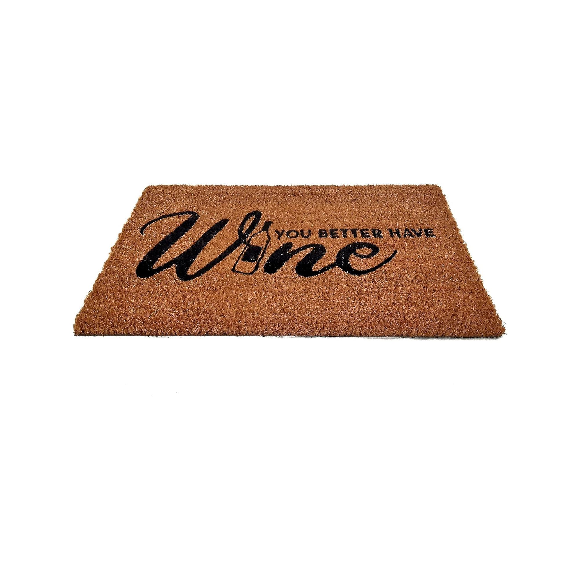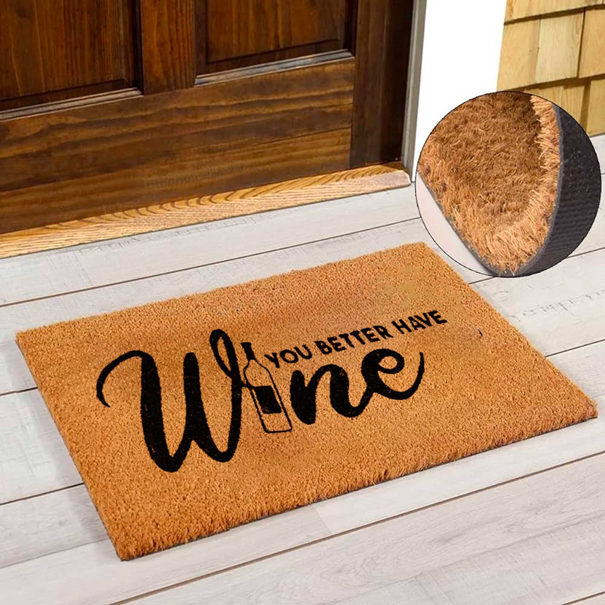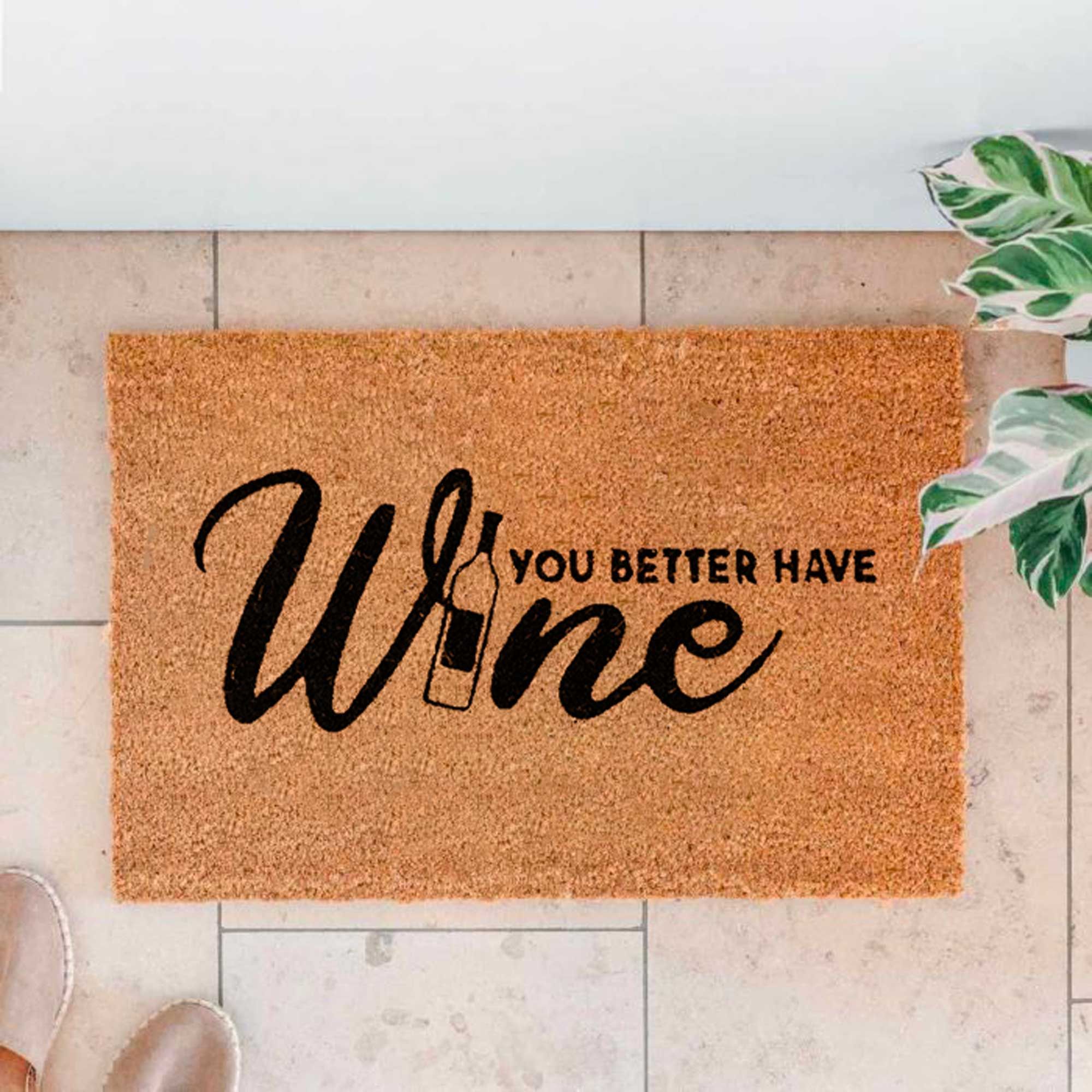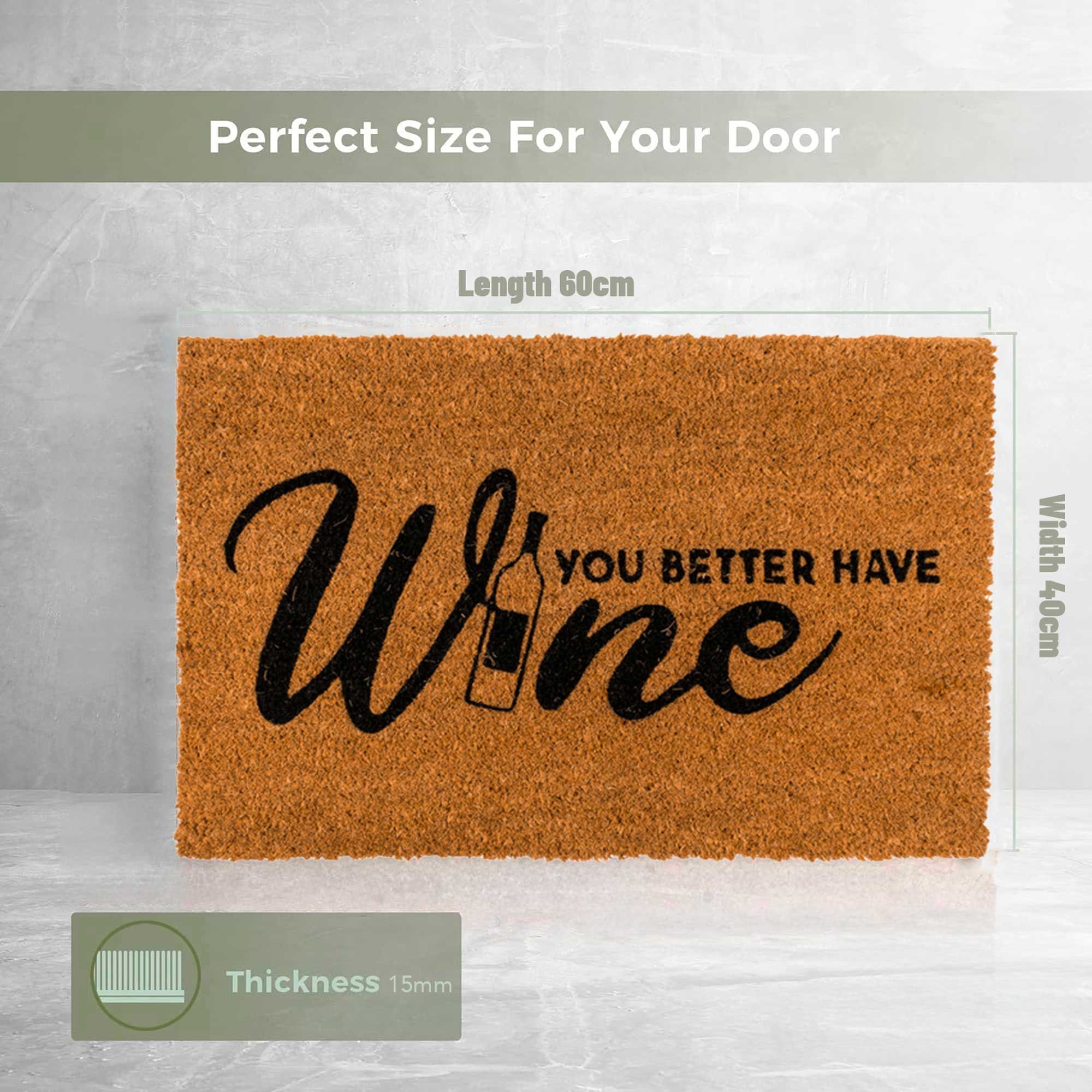 Le paillasson motif "You Better Have Wine" (tu ferais mieux d'avoir du vin) est conçu pour accueillir vos invités avec un trait d'humour. Mesurant 60 x 40 cm, il offre une taille idéale pour l'entrée de votre maison. Fabriqué en fibre de coco et caoutchouc, ce paillasson assure une durabilité et une résistance de grande qualité tout en piégeant efficacement la saleté.