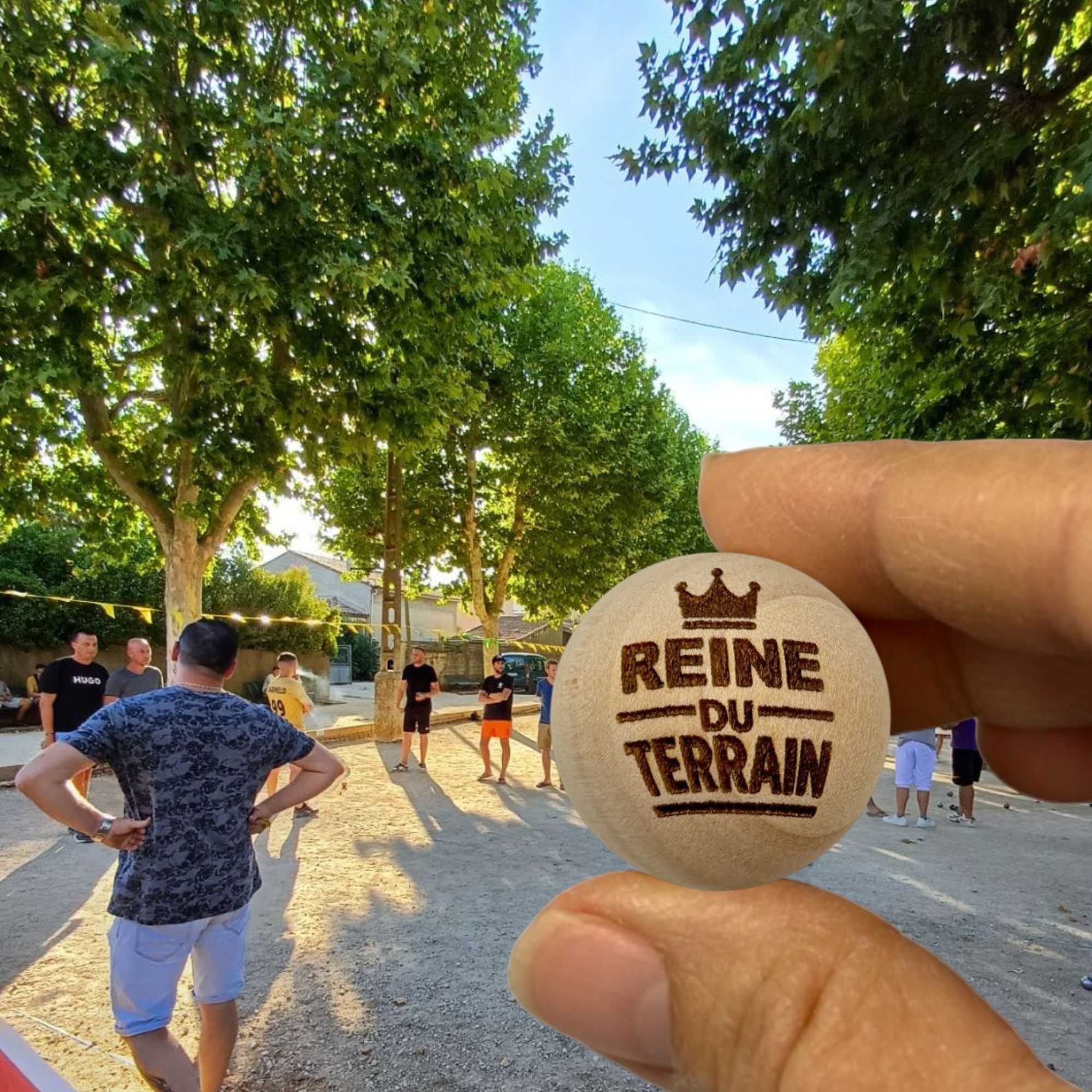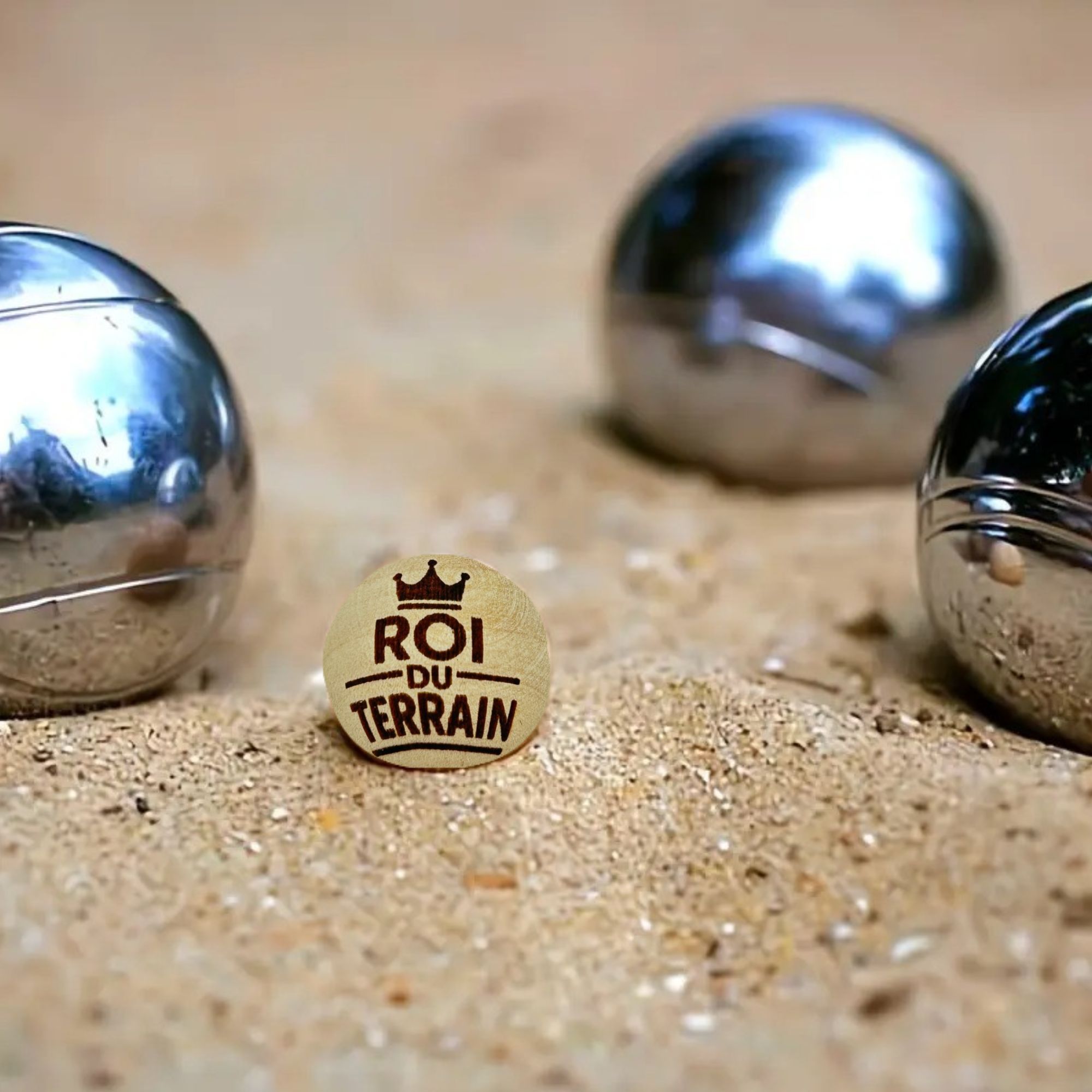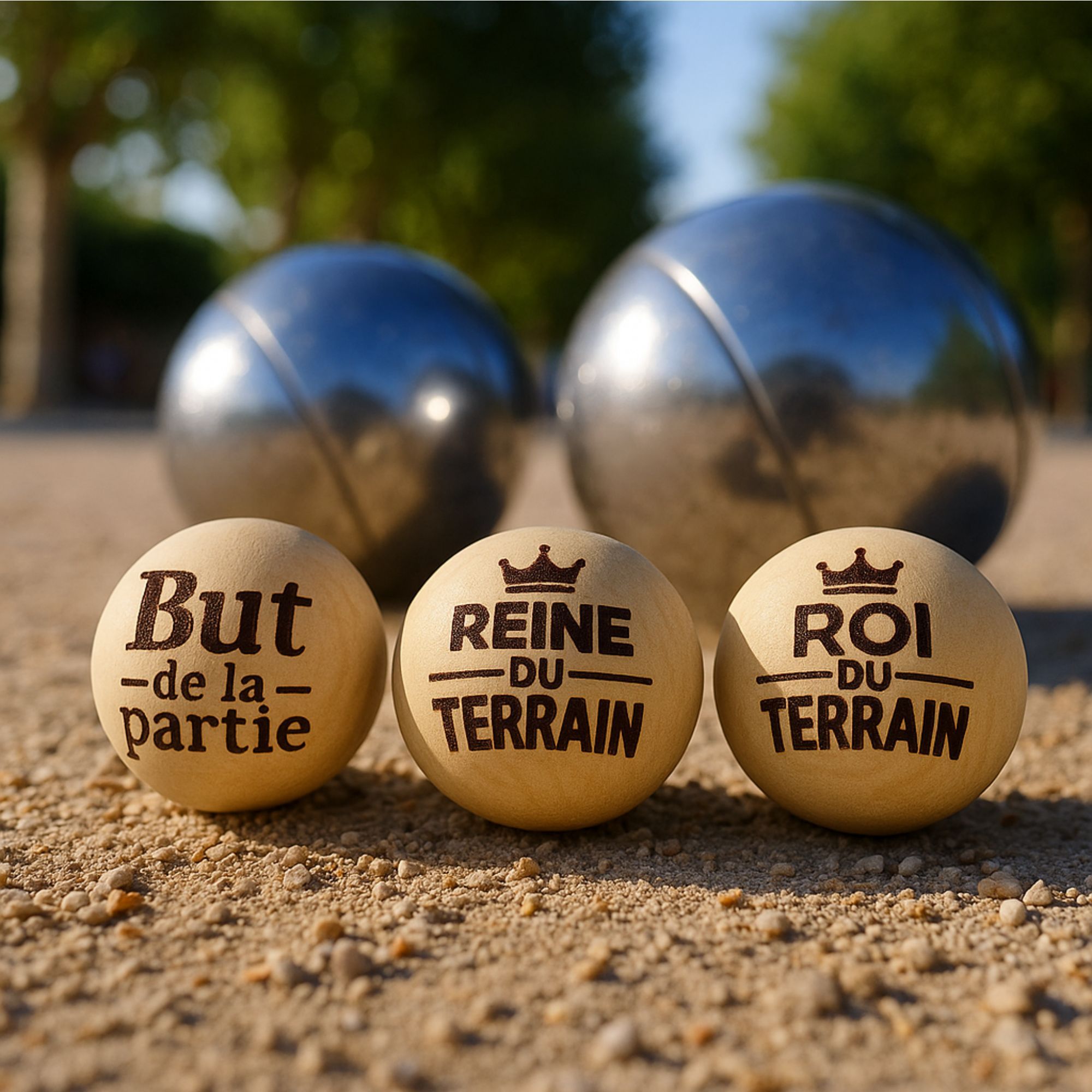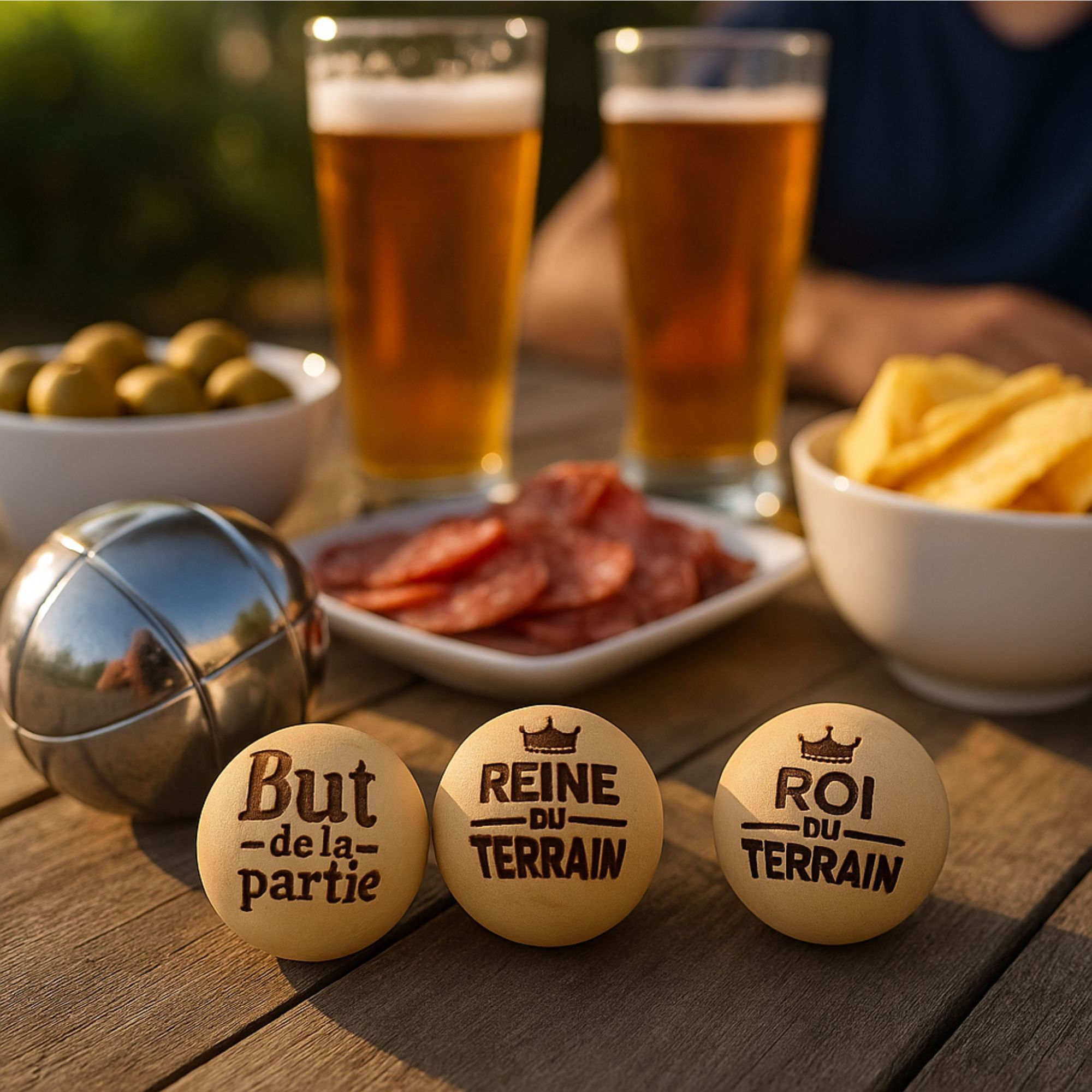 Découvrez notre lot de 3 cochonnets de pétanque en bois personnalisés avec messages humoristiques. Gravure laser durable, idéal pour cadeau ou club. Livraison rapide !