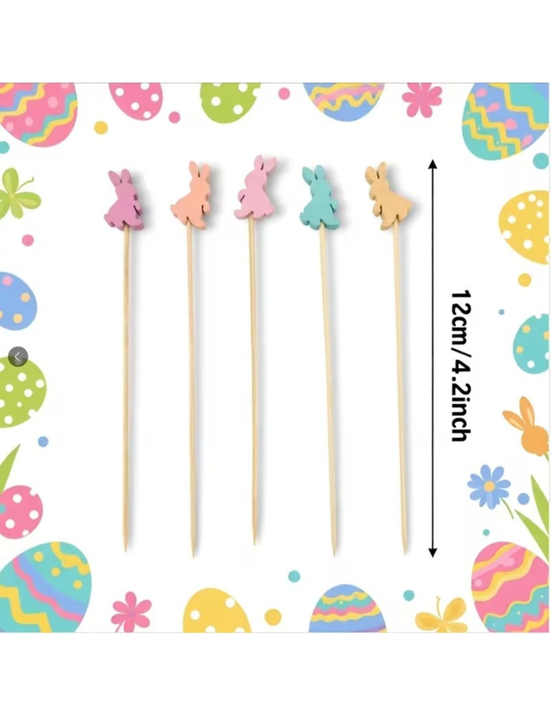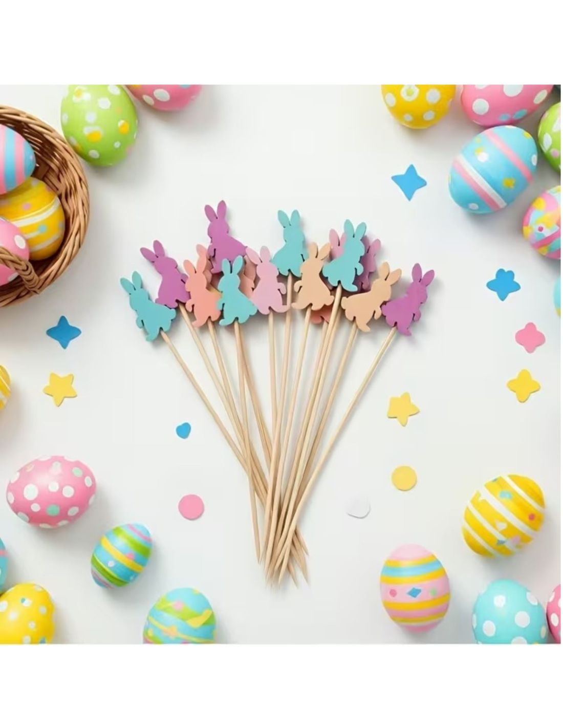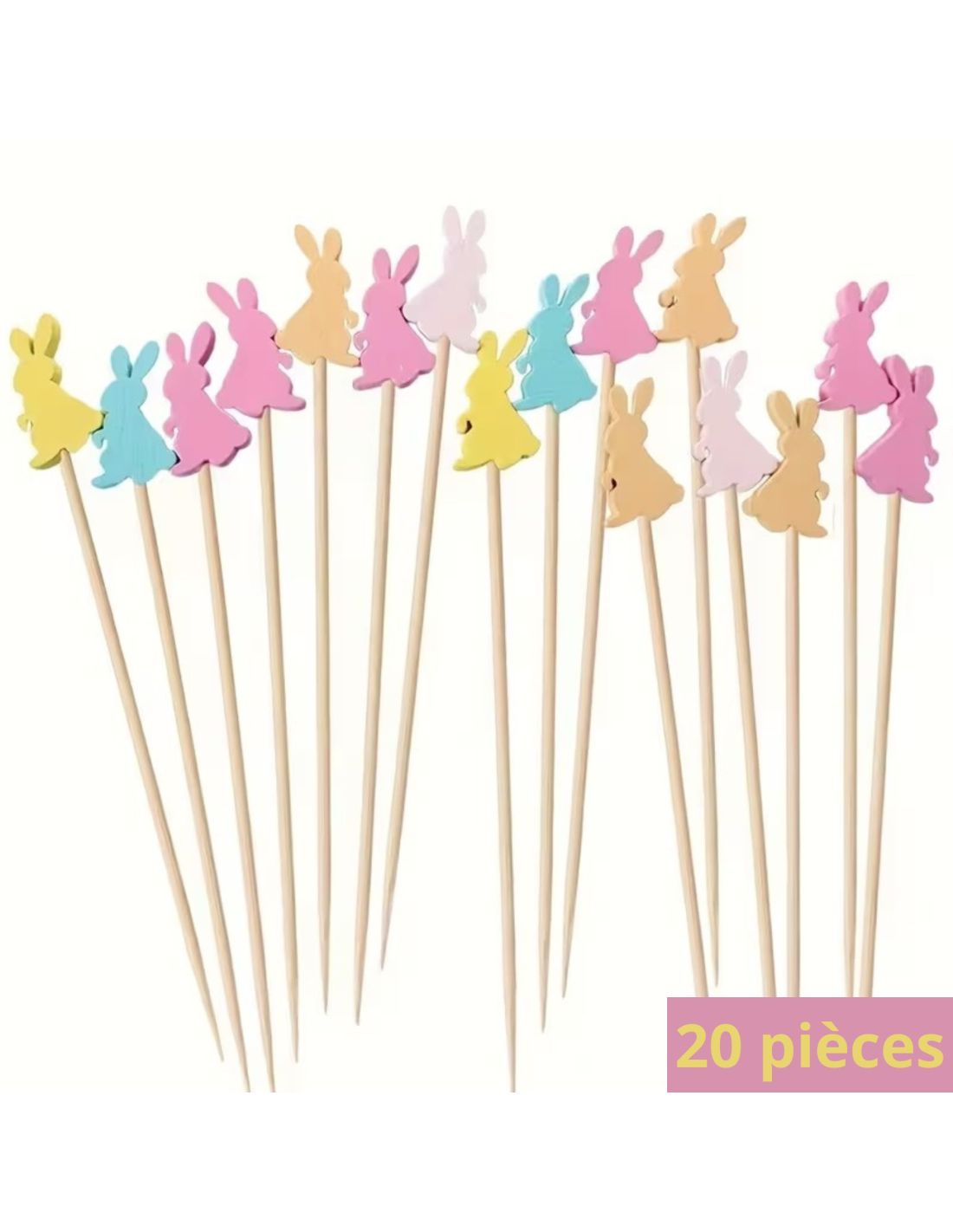 Transformez instantanément un simple goûter en une fête mémorable. Ces pics cocktail sont surmontés d'une silhouette de lapin minimaliste en bois peint, évoquant immédiatement la magie de la chasse aux œufs et l'arrivée du printemps. Les teintes douces et poudrées (pastel) s'harmonisent parfaitement avec les nappages de gâteaux, les fruits frais ou les fromages.