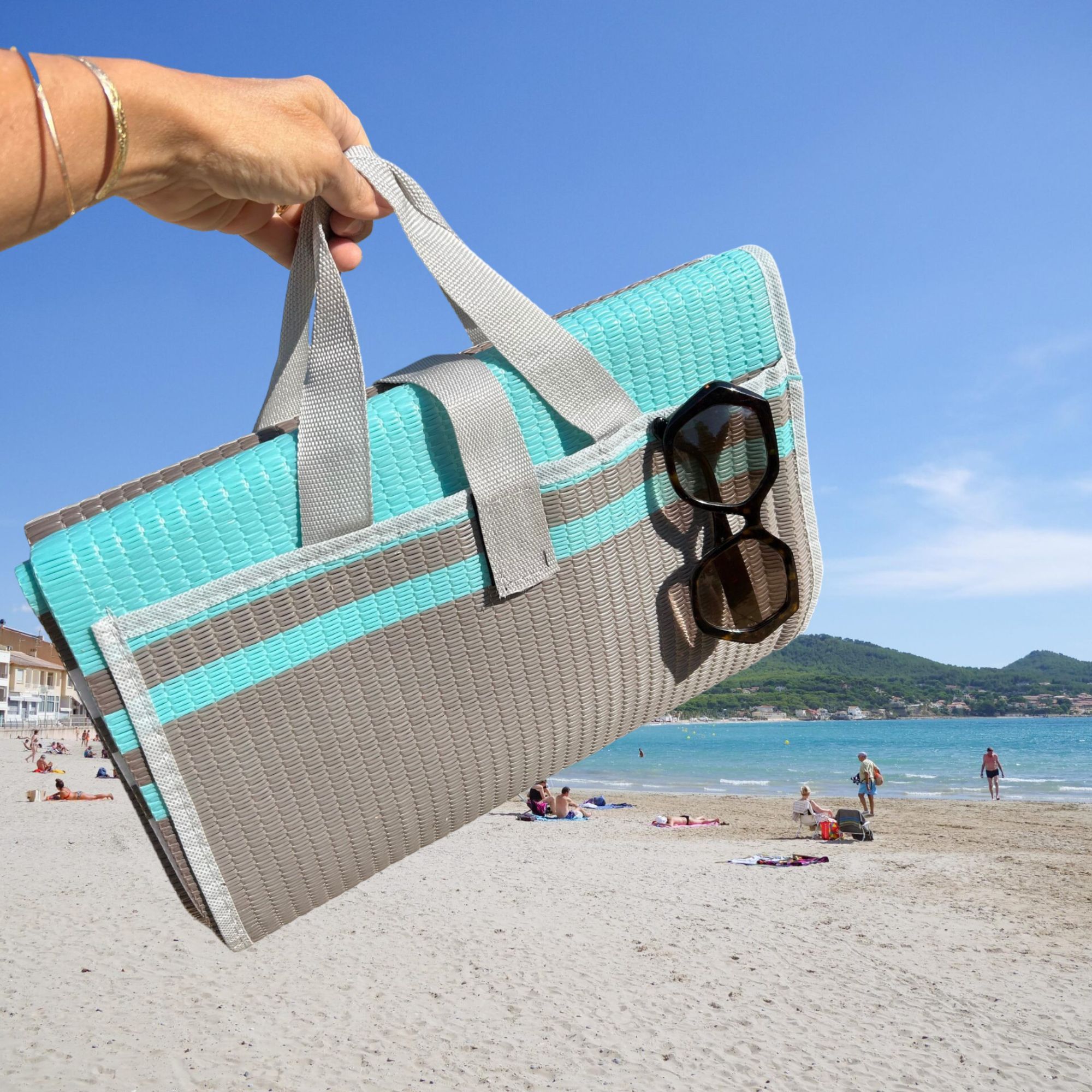 - Système de Pliage facile : Les poignées intégrées permettent de plier la natte comme un sac en quelques secondes, facilitant grandement le transport et le rangement.