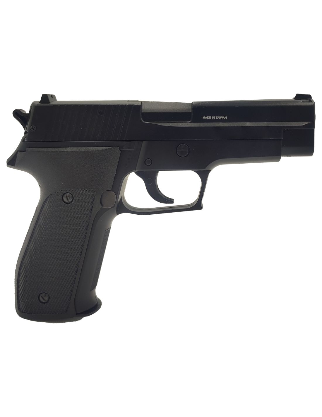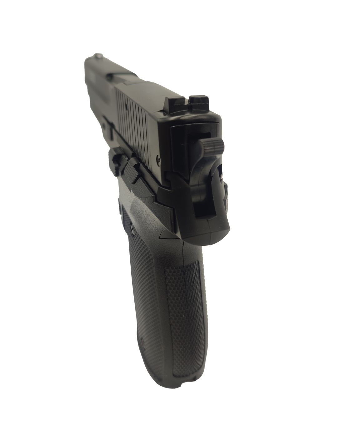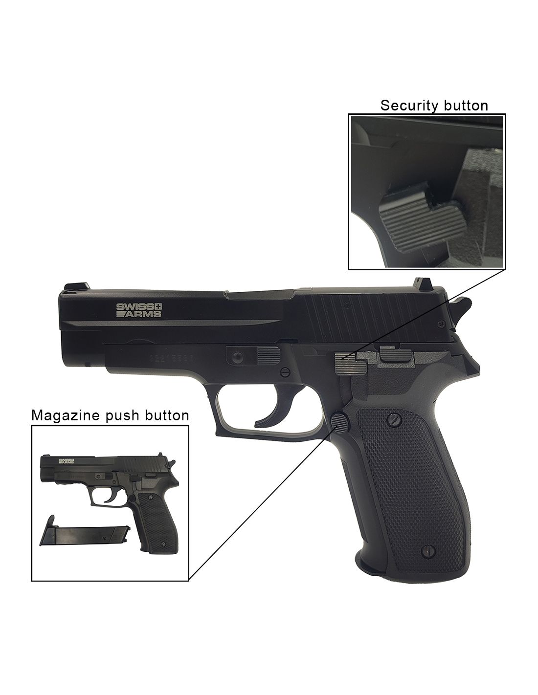 Le Swiss Arms Navy Pistol manuel 6mm dispose d'un grip anti dérapant. Il est composée d'un corps en plastique haute résistance (ABS) et d'une culasse métal. Son système d'armement s'effectue au niveau de la culasse qui suffit de tirer vers l'arrière jusqu'à entendre un clic. de la détente coté gauche. De plus, la réplique possède un bouton de mise en sécurité afin de ne pas pouvoir l'utiliser. Elle possède également un chargeur d'une capacité de 13 billes pour une dimensions de 20 x 14 cm et un poids de 480gr. Sa puissance s'élève à environ 0.5 joule(s).