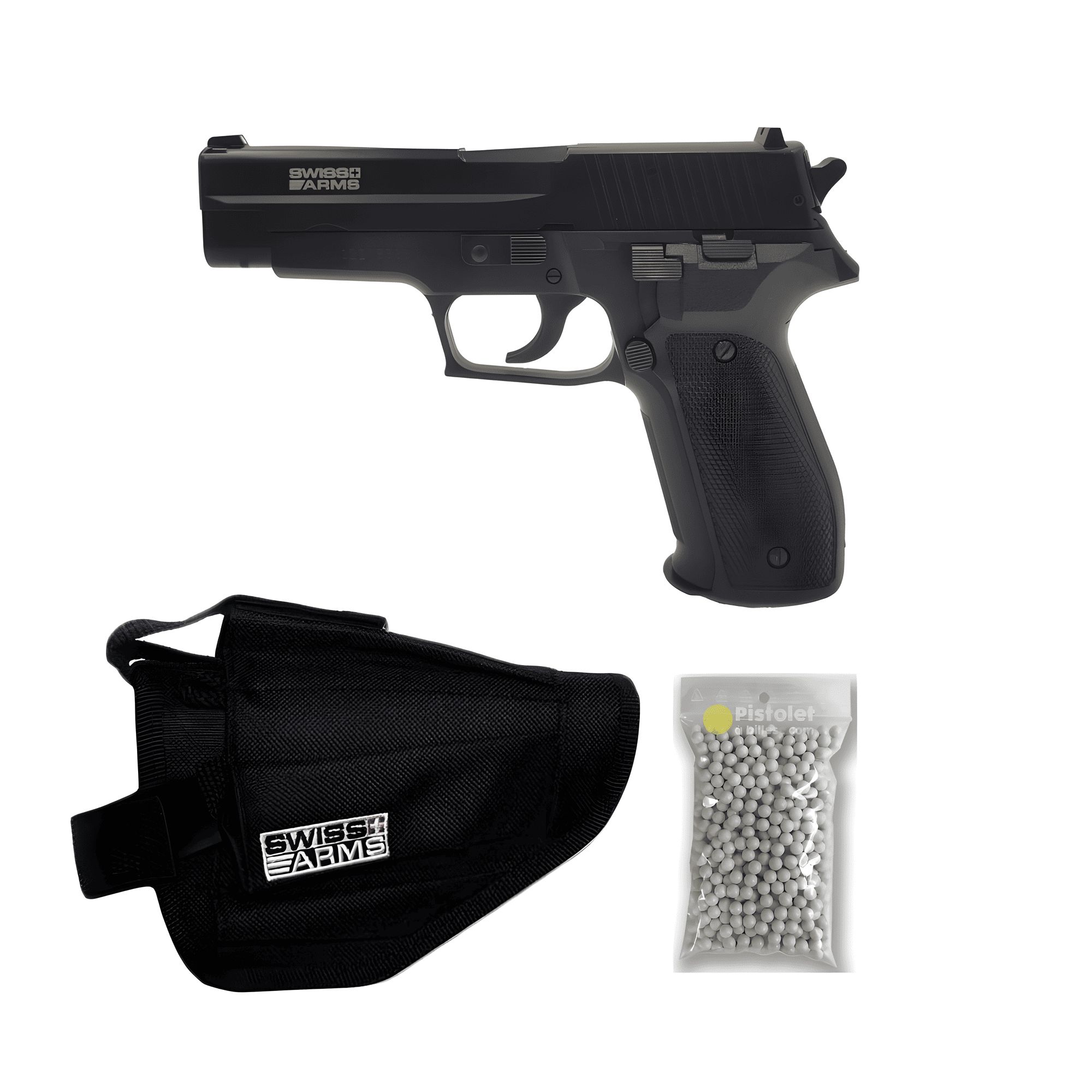 Retrouvez le dans sa version pack avec son sachet de 600 billes 0.20gr et un holster de ceinture noir Swiss Arms référence : 603611.